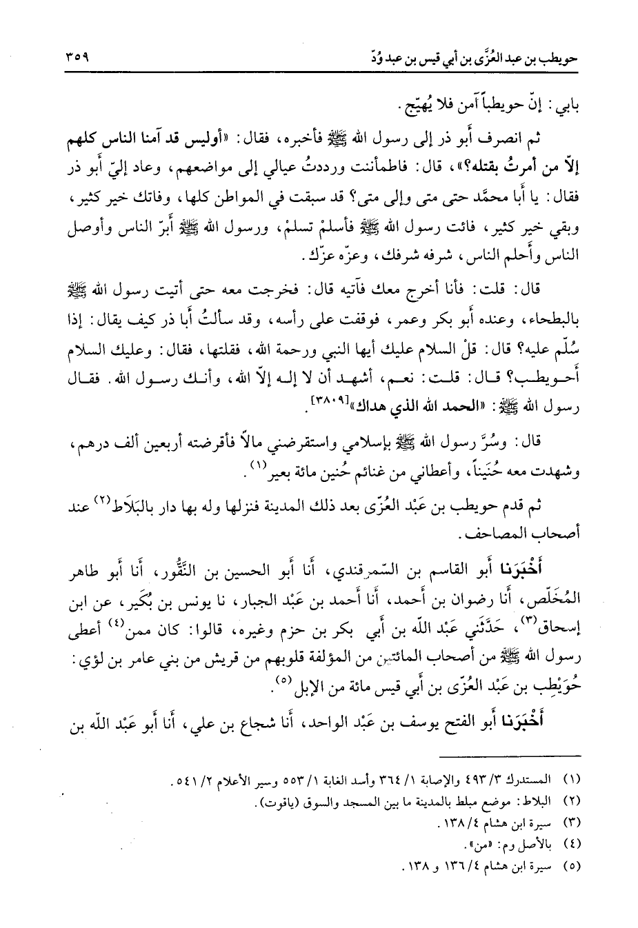 بابي إن حويطبا آمن فلا يهيج ثم انصرف أبو ذر إلى رسول الله (صلى الله عليه وسلم) فأخبره فقال أو ليس قد آمنا الناس كلهم إلا من أمرت بقتله ح قال فاطمأننت ورددت عيالي إلى مواضعهم وعاد إلي أبو ذر فقال يا أبا محمد حتى متى وإلى متى قد سبقت في المواطن كلها وفاتك خير كثير وبقي خير كثير فائت رسول الله (صلى الله عليه وسلم) فأسلم تسلم ورسول الله (صلى الله عليه وسلم) أبر الناس وأوصل الناس وأحلم الناس شرفه شرفك وعزه عزك قال قلت فأنا أخرج معك فآتيه قال فخرجت معه حتى أتيت رسول الله (صلى الله عليه وسلم) بالبطحاء وعنده أبو بكر وعمر فوقفت على رأسه وقد سألت أبا ذر كيف يقال إذا سلم عليه قال قل السلام عليك أيها النبي ورحمة الله فقلتها فقال وعليك السلام أحويطب قال قلت نعم أشهد أن لا إله إلا الله وأنك رسول الله فقال رسول الله (صلى الله عليه وسلم) الحمد لله الذي هداك (3809) قال وسر رسول الله (صلى الله عليه وسلم) بإسلامي واستقرضني مالا فأقرضته أربعين ألف درهم وشهدت معه حنينا وأعطاني من غنائم حنين مائة بعير (1) ثم قدم حويطب بن عبد العزى بعد ذلك المدينة فنزلها وله بها دار بالبلاط (2) عند أصحاب المصاحف أخبرنا أبو القاسم بن السمرقندي أنا أبو الحسين بن النقور أنا أبو طاهر المخلص أنا رضوان بن أحمد أنا أحمد بن عبد الجبار نا يونس بن بكير عن ابن إسحاق (3) حدثني عبد الله بن أبي بكر بن حزم وغيره قالوا كان ممن (4) أعطى رسول الله (صلى الله عليه وسلم) من أصحاب المائتين من المؤلفة قلوبهم من قريش من بني عامر بن لؤي حويطب بن عبد العزى بن أبي قيس مائة من الإبل (5) أخبرنا أبو الفتح يوسف بن عبد الواحد أنا شجاع بن علي أنا أبو عبد الله بن