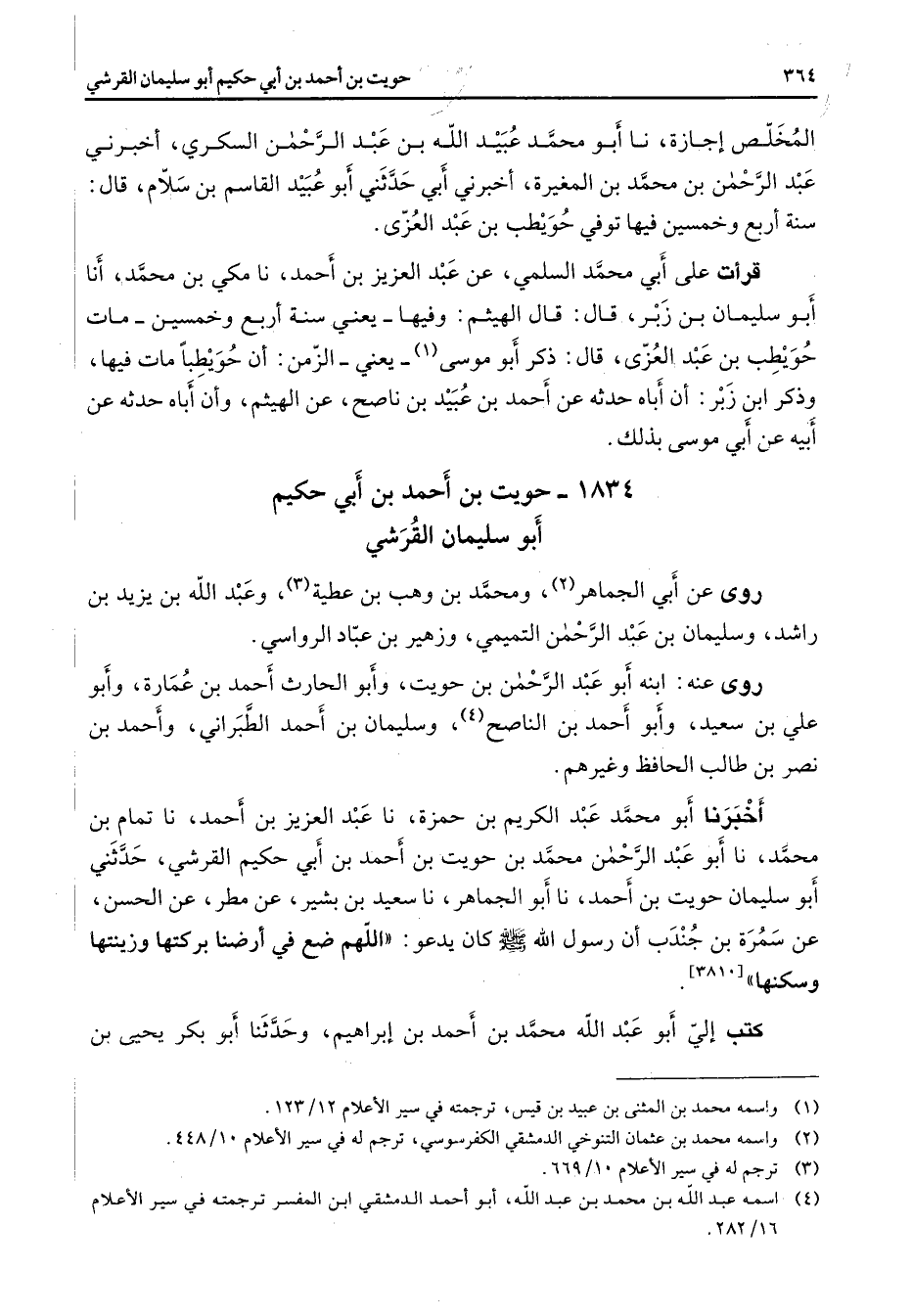 1834 - حويت بن أحمد بن أبي حكيم أبو سليمان القرشي روى عن أبي الجماهر (2) ومحمد بن وهب بن عطية (3) وعبد الله بن يزيد بن راشد وسليمان بن عبد الرحمن التميمي وزهير بن عباد الرواسي روى عنه ابنه عبد الرحمن بن حويت وأبو الحارث أحمد بن عمارة وأبو علي بن سعيد وأبو أحمد بن الناصح (4) وسليمان بن أحمد الطبراني وأحمد بن نصر بن طالب الحافظ وغيرهم أخبرنا أبو محمد عبد الكريم بن حمزة نا عبد العزيز بن أحمد نا تمام بن محمد نا أبو عبد الرحمن محمد بن حويت بن أحمد بن أبي حكيم القرشي حدثني أبو سليمان حويت بن أحمد نا أبو الجماهر نا سعيد بن بشير عن مطر عن الحسن عن سمرة بن جندب أن رسول الله (صلى الله عليه وسلم) كان يدعو اللهم ضع في أرضنا بركتها وزينتها وسكنها (3810) كتب إلي أبو عبد الله محمد بن أحمد بن إبراهيم وحدثنا أبو بكر يحيى بن