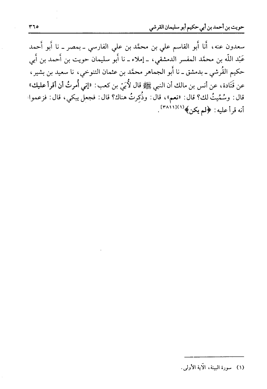 سعدون عنه أنا أبو القاسم علي بن محمد بن علي الفارسي بمصر نا أبو أحمد عبد الله بن محمد المفسر الدمشقي إملاء نا أبو سليمان حويت بن أحمد بن أبي حكيم القرشي بدمشق نا أبو الجماهر محمد بن عثمان التنوخي نا سعيد بن بشير عن قتادة عن أنس بن مالك أن النبي (صلى الله عليه وسلم) قال لأبي بن كعب إني أمرت أن أقرأ عليك قال وسميت لك قال نعم قال وذكرت هناك قال فجعل يبكي قال فزعموا أنه قرأ عليه " لم يكن " (1) (3811)