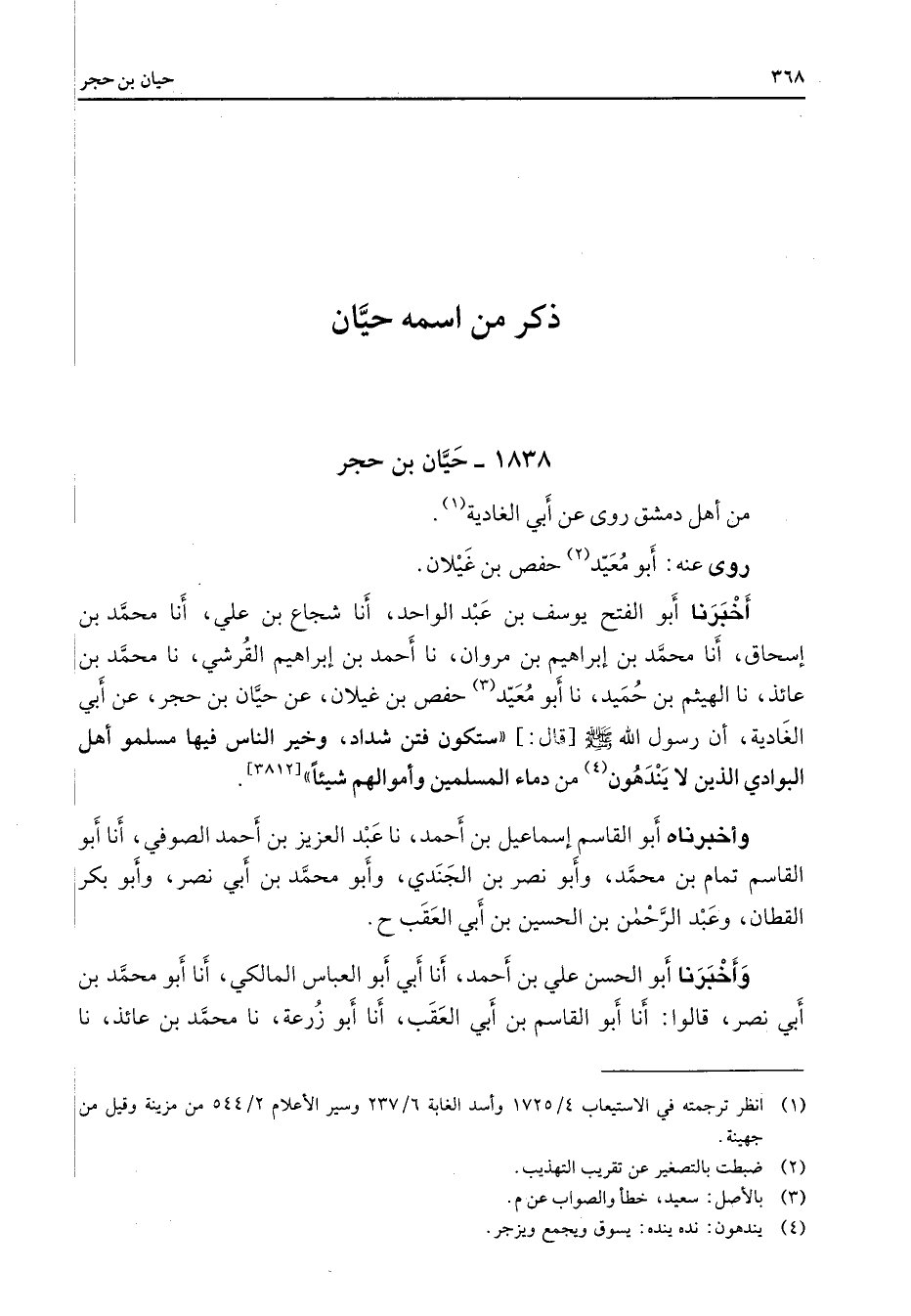1838 - حيان بن حجر من أهل دمشق روى عن أبي الغادية (1) روى عنه أبو معيد (2) حفص بن غيلان أخبرنا أبو الفتح يوسف بن عبد الواحد أنا شجاع بن علي أنا محمد بن إسحاق أنا محمد بن إبراهيم بن مروان نا أحمد بن إبراهيم القرشي نا محمد بن عائذ نا الهيثم بن حميد نا أبو معيد (3) حفص بن غيلان عن حيان بن حجر عن أبي الغادية أن رسول الله (صلى الله عليه وسلم) قال ستكون فتن شداد وخير الناس فيها مسلمو أهل البوادي الذين لا يندهون من دماء المسلمين وأموالهم شيئا (3812) وأخبرناه أبو القاسم إسماعيل بن أحمد نا عبد العزيز بن أحمد الصوفي أنا أبو القاسم تمام بن محمد وأبو نصر بن الجندي وأبو محمد بن أبي نصر وأبو بكر القطان وعبد الرحمن بن الحسين بن أبي العقب ح وأخبرنا أبو الحسن علي بن أحمد أنا أبي أبو العباس المالكي أنا أبو محمد بن أبي نصر قالوا أنا أبو القاسم بن أبي العقب أنا أبو زرعة نا محمد بن عائذ نا