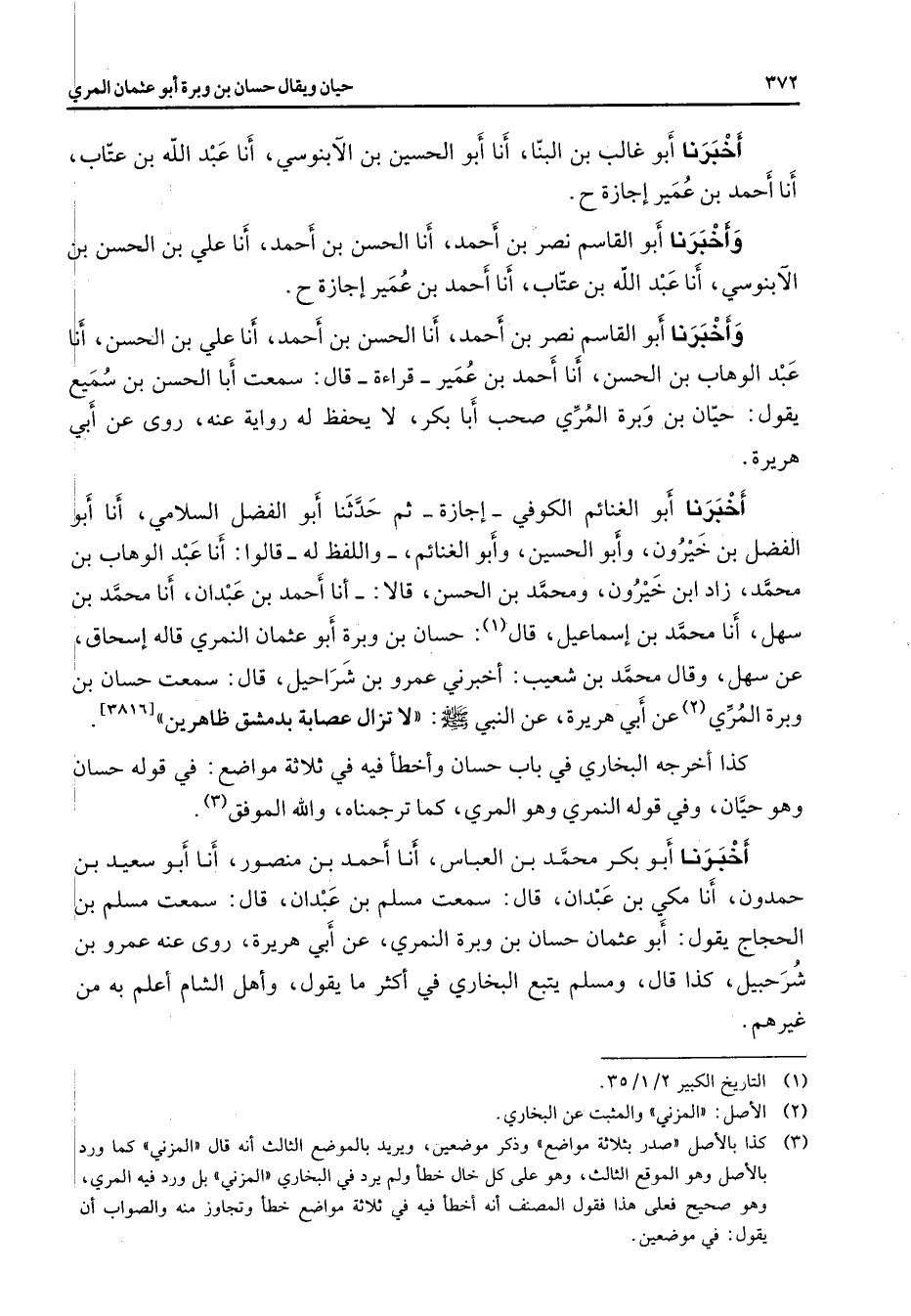 أخبرنا أبو غالب بن البنا أنا أبو الحسين بن الآبنوسي أنا عبد الله بن عتاب أنا أحمد بن عمير إجازة ح وأخبرنا أبو القاسم نصر بن أحمد أنا الحسن بن أحمد أنا علي بن الحسن بن الآبنوسي أنا عبد الله بن عتاب أنا أحمد بن عمير إجازة ح وأخبرنا أبو القاسم نصر بن أحمد أنا الحسن بن أحمد أنا علي بن الحسن أنا عبد الوهاب بن الحسن أنا أحمد بن عمير قراءة قال سمعت أبا الحسن بن سميع يقول حيان بن وبرة المري صحب أبا بكر لا يحفظ له رواية عنه روى عن أبي هريرة أخبرنا أبو الغنائم الكوفي إجازة ثم حدثنا أبو الفضل السلامي أنا أبو الفضل بن خيرون وأبو الحسين وأبو الغنائم واللفظ له قالوا أنا عبد الوهاب بن محمد زاد ابن خيرون ومحمد بن الحسن قالا أنا أحمد بن عبدان أنا محمد بن سهل أنا محمد بن إسماعيل قال (1) حسان بن وبرة أبو عثمان النمري قاله إسحاق عن سهل وقال محمد بن شعيب أخبرني عمرو بن شراحيل قال سمعت حسان بن وبرة المري (2) عن أبي هريرة عن النبي (صلى الله عليه وسلم) لا تزال عصابة بدمشق ظاهرين (3816) كذا أخرجه البخاري في باب حسان وأخطأ فيه في ثلاثة مواضع في قوله حسان وهو حيان وفي قوله النمري وهو المري كما ترجمناه والله الموفق (3) أخبرنا أبو بكر محمد بن العباس أنا أحمد بن منصور أنا أبو سعيد بن حمدون أنا مكي بن عبدان قال سمعت مسلم بن عبدان قال سمعت مسلم بن الحجاج يقول أبو عثمان حسان بن وبرة النمري عن أبي هريرة روى عنه عمرو بن شرحبيل كذا قال ومسلم يتبع البخاري في أكثر ما يقول وأهل الشام أعلم به من غيرهم