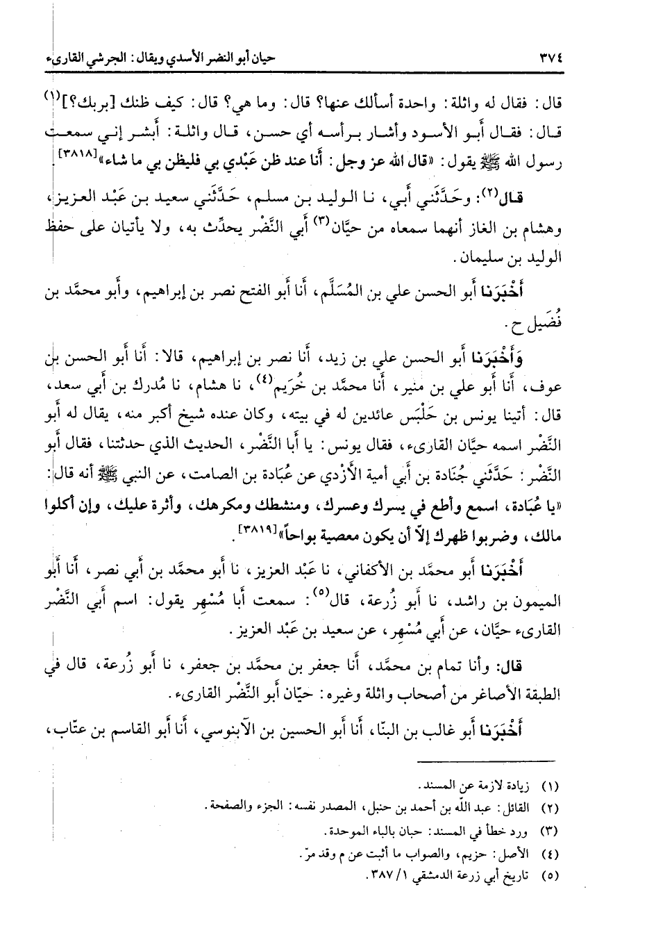 قال فقال له واثلة واحدة أسألك عنها قال وما هي قال كيف ظنك بربك (1) قال فقال أبو الأسود وأشار برأسه أي حسن قال واثلة أبشر إني سمعت رسول الله (صلى الله عليه وسلم) يقول قال الله عز وجل أنا عند ظن عبدي بي فليظن بي ما شاء (3818) قال وحدثني أبي نا الوليد بن مسلم حدثني سعيد بن عبد العزيز وهشام بن الغاز أنهما سمعاه من حيان (3) أبي النضر يحدث به ولا يأتيان على حفظ الوليد بن سليمان أخبرنا أبو الحسن علي بن المسلم أنا أبو الفتح نصر بن إبراهيم وأبو محمد بن فضيل ح وأخبرنا أبو الحسن علي بن زيد أنا نصر بن إبراهيم قالا أنا أبو الحسن بن عوف أنا أبو علي بن منير أن محمد بن خريم (4) نا هشام نا مدرك بن أبي سعد قال أتينا يونس بن حلبس عائدين له في بيته وكان عنده شيخ أكبر منه يقال له أبو النضر اسمه حيان القارئ فقال يونس يا أبا النضر الحديث الذي حدثتنا فقال أبو النضر حدثني جنادة بن أبي أمية الأزدي عن عبادة بن الصامت عن النبي (صلى الله عليه وسلم) أنه قال يا عبادة اسمع وأطع في يسرك وعسرك ومنشطك ومكرهك وأثرة عليك وإن أكلوا مالك وضربوا ظهرك إلا أن يكون معصية بواحا (3819) أخبرنا أبو محمد بن الأكفاني نا عبد العزيز نا أبو محمد بن أبي نصر أنا أبو الميمون بن راشد نا أبو زرعة قال (5) سمعت أبا مسهر يقول اسم أبي النضر القارئ حيان عن أبي مسهر عن سعيد بن عبد العزيز قال وأنا تمام بن محمد أنا جعفر بن محمد بن جعفر نا أبو زرعة قال في الطبقة الأصاغر من أصحاب واثلة وغيره حيان أبو النضر القارئ أخبرنا أبو غالب بن البنا أنا أبو الحسين بن الآبنوسي أنا أبو القاسم بن عتاب