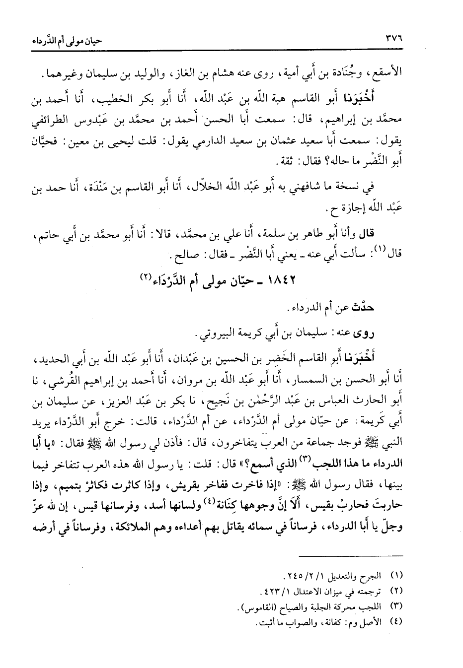 1842 - حيان مولى أم الدرداء (2) حدث عن أم الدرداء روى عنه سليمان بن أبي كريمة البيروتي أخبرنا أبو القاسم الخضر بن الحسين بن عبدان أنا أبو عبد الله بن أبي الحديد أنا أبو الحسن بن السمسار أنا أبو عبد الله بن مروان أنا أحمد بن إبراهيم القرشي نا أبو الحارث العباس بن عبد الرحمن بن نجيح نا بكر بن عبد العزيز عن سليمان بن أبي كريمة عن حيان مولى أم الدرداء عن أم الدرداء قالت خرج أبو الدرداء يريد النبي (صلى الله عليه وسلم) فوجد جماعة من العرب يتفاخرون قال فأذن لي رسول الله (صلى الله عليه وسلم) فقال يا أبا الدرداء ما هذا اللجب (3) الذي أسمع قال قلت يا رسول الله هذه العرب تتفاخر فيما بينها فقال رسول الله (صلى الله عليه وسلم) إذا فاخرت ففاخر بقريش وإذا كاثرت فكاثر بتميم وإذا حاربت فحارب بقيس ألا إن وجوهها كنانة (4) ولسانها أسد وفرسانها قيس إن لله عز وجل يا أبا الدرداء فرسانا في سمائه يقاتل بهم أعداءه وهم الملائكة وفرسانا في أرضه