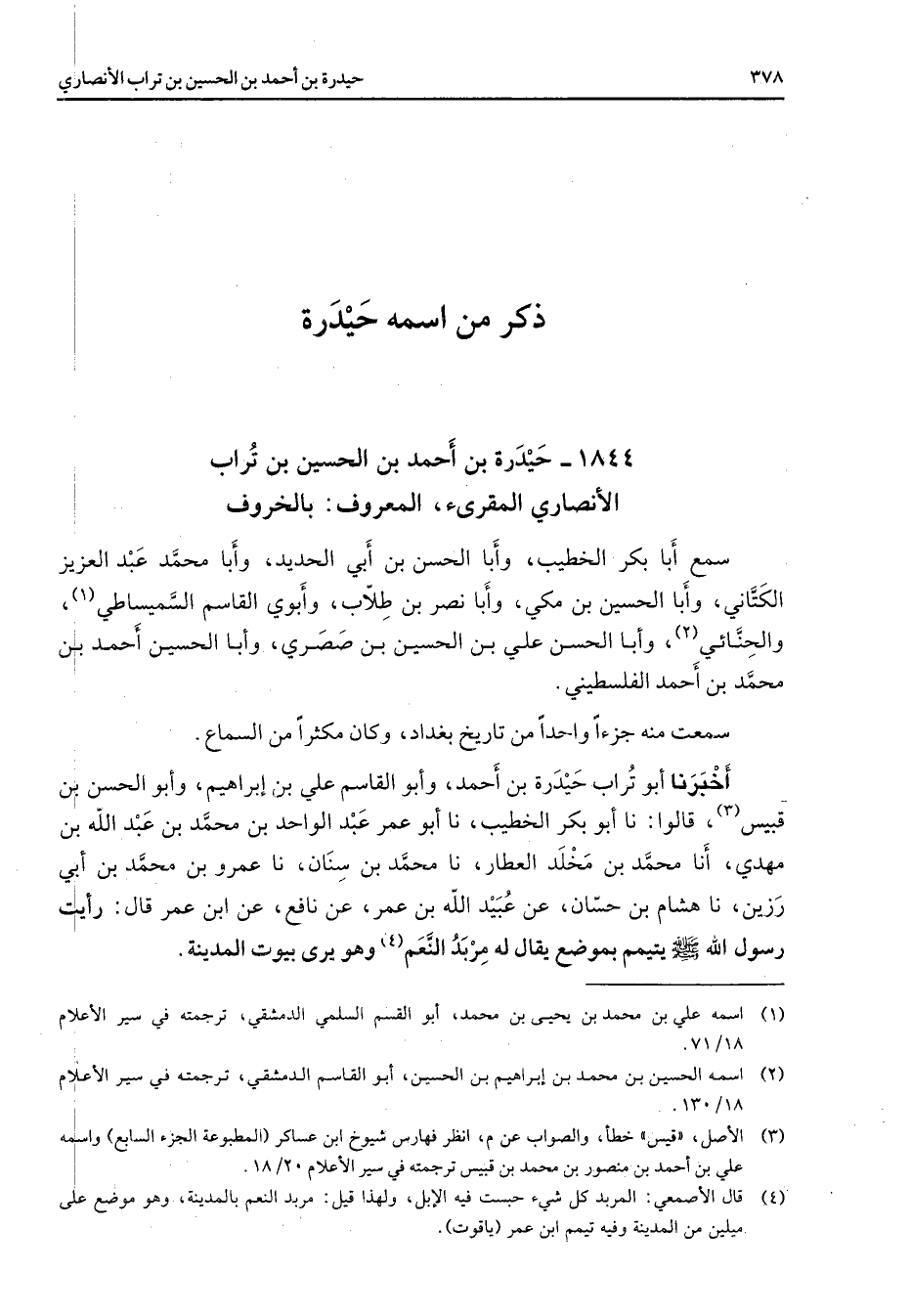 1844 - حيدرة بن أحمد بن الحسين بن تراب الأنصاري المقرئ المعروف بالخروف سمع أبا بكر الخطيب وأبا الحسن بن أبي الحديد وأبا محمد عبد العزيز الكتاني وأبا الحسين بن مكي وأبا نصر بن طلاب وأبوي القاسم السميساطي (1) والحنائي (2) وأبا الحسن علي بن الحسين بن صصري وأبا الحسين أحمد بن محمد بن أحمد الفلسطيني سمعت منه جزءا واحدا من تاريخ بغداد وكان مكثرا من السماع أخبرنا أبو تراب حيدرة بن أحمد وأبو القاسم علي بن إبراهيم وأبو الحسن بن قبيس (3) قالوا نا أبو بكر الخطيب نا أبو عمر عبد الواحد بن محمد بن عبد الله بن مهدي أنا محمد بن مخلد العطار نا محمد بن سنان نا عمرو بن محمد بن أبي رزين نا هشام بن حسان عن عبيد الله بن عمر عن نافع عن ابن عمر قال رأيت رسول الله (صلى الله عليه وسلم) يتيمم بموضع يقال له مربد النعم (4) وهو يرى بيوت المدينة