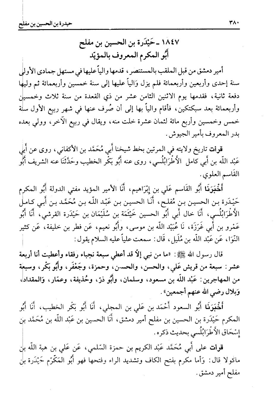 1847 - حيدرة بن الحسين بن مفلح أبو المكرم المعروف بالمؤيد أمير دمشق من قبل الملقب بالمستنصر قدمها واليا عليها في مستهل جمادى الأولى سنة إحدى وأربعين وأربعمائة فلم يزل واليا عليها إلى سنة خمسين وأربعمائة ثم وليها دفعة ثانية فقدمها يوم الاثنين الثامن عشر من ذي القعدة من سنة ثلاث وخمسين وأربعمائة بعد سبكتكين فأقام واليا بها إلى أن صرف عنها في شهر ربيع الأول سنة خمس وخمسين وأربع مائة لثمان عشرة خلت منه ويقال في ربيع الآخر وولي بعده بدر المعروف بأمير الجيوش قرأت تاريخ ولايته في المرتين بخط شيخنا أبي محمد بن الأكفاني روى عن أبي عبد الله بن أبي كامل الأطرابلسي روى عنه أبو بكر الخطيب وحدثنا عنه الشريف أبو القاسم العلوي أخبرنا أبو القاسم علي بن إبراهيم أنا الأمير المؤيد مفتي الدولة أبو المكرم حيدرة بن الحسين بن مفلح أنا الحسين بن عبد الله بن محمد بن أبي كامل الأطرابلسي أنا خال أبي أبو الحسين خيثمة بن سليمان بن حيدرة القرشي أنا أبو عمرو بن أبي غرزة نا عبيد الله بن موسى وأبو نعيم عن فطر بن خليفة عن كثير النوا عن عبد الله بن مليل قال سمعت عليا عليه السلام يقول قال رسول الله (صلى الله عليه وسلم) ما من نبي إلا قد أعطي سبعة نجباء رفقاء وأعطيت أنا أربعة عشر سبعة من قريش علي والحسن والحسين وحمزة وجعفر وأبو بكر وسبعة من المهاجرين عبد الله بن مسعود وسلمان وأبو ذر وحذيفة وعمار والمقداد وبلال Bهم أجمعين أخبرنا أبو السعود أحمد بن علي بن المجلي أنا أبو بكر الخطيب أنا أبو المكرم حيدرة بن الحسين بن مفلح أمير دمشق أنا الحسين بن عبد الله بن محمد بن إسحاق الأطرابلسي بحديث ذكره قرأت على أبي محمد عبد الكريم بن حمزة السلمي عن علي بن هبة الله بن ماكولا قال وأما مكرم بفتح الكاف وتشديد الراء وفتحها فهو أبو المكرم حيدرة بن مفلح أمير دمشق
