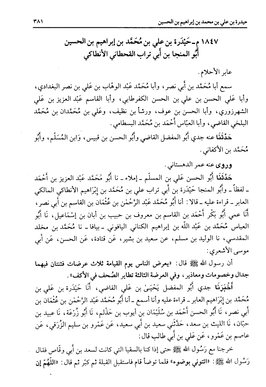 1847 - م حيدرة بن علي بن محمد بن إبراهيم بن الحسين أبو المنجا بن أبي تراب القحطاني الأنطاكي عابر الأحلام سمع أبا محمد بن أبي نصر وأبا محمد عبد الوهاب بن علي بن نصر البغدادي وأبا علي الحسن بن علي بن الحسين الكفرطابي وأبا القاسم عبد العزيز بن علي الشهرزوري وأبا الحسن بن عوف ورشأ بن نظيف وعلي بن محمدان بن محمد البلخي القاضي وأبا العباس أحمد بن محمد البسطامي حدثنا عنه جدي أبو المفضل القاضي وأبو الحسن بن قبيس وابن المسلم وأبو محمد بن الأكفاني وروى عنه عمر الدهستاني حدثنا أبو الحسن علي بن المسلم إملاء نا أبو محمد عبد العزيز بن أحمد لفظا وأبو المنجا حيدرة بن أبي تراب علي بن محمد بن إبراهيم الأنطاكي المالكي العابر قراءة عليه قالا أنا أبو محمد عبد الرحمن بن عثمان بن القاسم بن أبي نصر أنا عمي أبو بكر أحمد بن القاسم بن معروف بن حبيب بن أبان بن إسماعيل نا أبو العباس محمد بن عبد الله بن إبراهيم الكناني اليافوني بيافا نا محمد بن مخلد المقدسي نا الوليد بن مسلم عن سعيد بن بشير عن قتادة عن الحسن عن أبي موسى الأشعري أنا رسول الله (صلى الله عليه وسلم) قال يعرض الناس يوم القيامة ثلاث عرضات فثنتان فيهما جدال وخصومات ومعاذير وفي العرضة الثالثة تطاير الصحف في الأكف ح أخبرنا جدي أبو المفضل يحيى بن علي القاضي أنا حيدرة بن علي بن محمد بن إبراهيم العابر قراءة عليه وأنا أسمع أنا أبو محمد عبد الرحمن بن عثمان بن أبي نصر نا أبو الحسن أحمد بن سليمان بن أيوب بن حذلم نا أبو زرعة نا عبيد بن حبان نا الليث بن سعد حدثني سعيد بن أبي سعيد عن عمرو بن سليم الزرقي عن عاصم بن عمرو عن علي بن أبي طالب قال خرجنا مع رسول الله (صلى الله عليه وسلم) حتى إذا كان بالسقيا التي كانت لسعد بن أبي وقاص فقال رسول الله (صلى الله عليه وسلم) ائتوني بوضوء فلما توضأ قام فاستقبل القبلة ثم كبر ثم قال اللهم إن