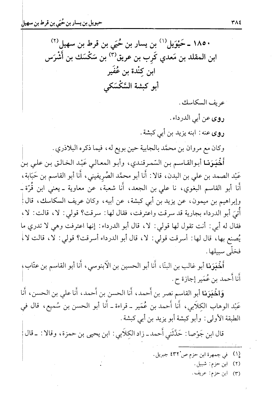 1850 - حيويل (1) بن يسار بن حيي بن قرط بن سهيل (2) ابن المقلد بن معدي كرب بن عريق (3) بن سكسك بن أشرس ابن كندة بن عفير أبو كبشة السكسكي عريف السكاسك روى عن أبي الدرداء روى عنه ابنه يزيد بن أبي كبشة وكان مع مروان بن محمد بالجابية حين بويع له فيما ذكره البلاذري أخبرنا أبو القاسم بن السمرقندي وأبو المعالي عبد الخالق بن علي بن عبد الصمد بن علي بن البدن قالا أنا أبو محمد الصريفيني أنا أبو القاسم بن حبابة أنا أبو القاسم البغوي نا علي بن الجعد أنا شعبة عن معاوية يعني ابن قرة وإبراهيم بن ميمون عن يزيد بن أبي كبشة عن أبيه وكان عريف السكاسك قال أتي أبو الدرداء بجارية قد سرقت واعترفت فقال لها سرقت قولي لا قالت لا فقال له أبي أنت تقول لها قولي لا قال أبو الدرداء إنها اعترفت وهي لا تدري ما يصنع بها قال لها أسرقت قولي لا قال أبو الدرداء أسرقت قولي لا قالت لا فخلى سبيلها أخبرنا أبو غالب بن البنا أنا أبو الحسين بن الآبنوسي أنا أبو القاسم بن عتاب أنا أحمد بن عمير إجازة ح وأخبرنا أبو القاسم نصر بن أحمد أنا الحسن بن أحمد أنا علي بن الحسن أنا عبد الوهاب الكلابي أنا أحمد بن عمير قراءة أنا أبو الحسن بن سميع قال في الطبقة الأولى وأبو كبشة أبو يزيد بن أبي كبشة قال ابن جوصا حدثني أحمد زاد الكلابي ابن يحيى بن حمزة وقالا قال