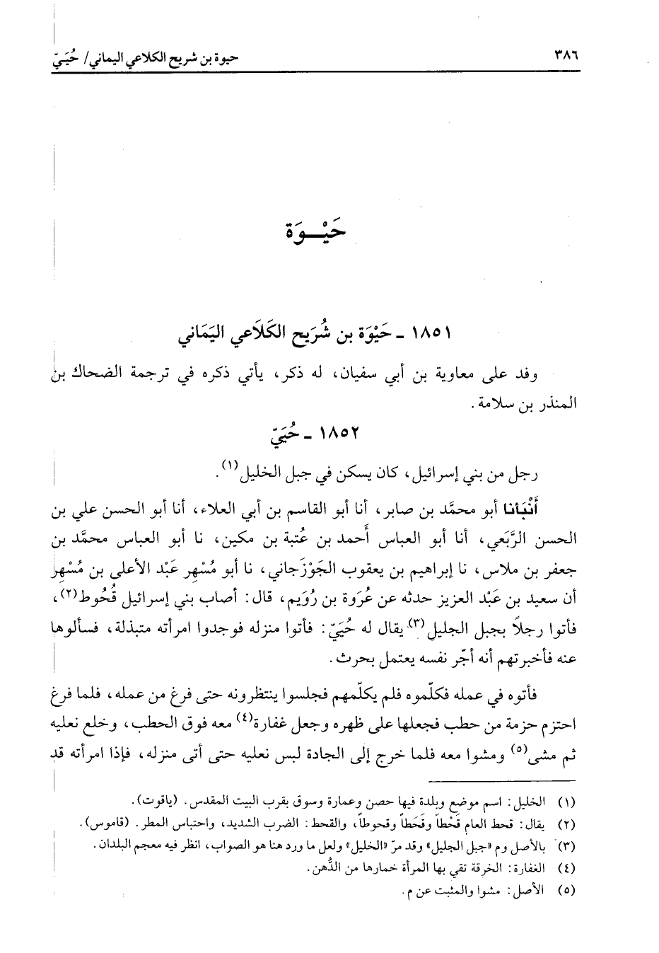1852 - حيي رجل من بني إسرائيل كان يسكن في جبل الخليل (1) أنبأنا أبو محمد بن صابر أنا أبو القاسم بن أبي العلاء أنا أبو الحسن علي بن الحسن الربعي أنا أبو العباس أحمد بن عتبة بن مكين نا أبو العباس محمد بن جعفر بن ملاس نا إبراهيم بن يعقوب الجوزجاني نا أبو مسهر عبد الأعلى بن مسهر أن سعيد بن عبد العزيز حدثه عن عروة بن رويم قال أصحاب بني إسرائيل قحوط (2) فأتوا رجلا بجبل الجليل (3) يقال له حيي فأتوا منزله فوجدوا امرأته متبذلة فسألوها عنه فأخبرتهم أنه أجر نفسه يعتمل بحرث فأتوه في عمله فكلموه فلم يكلمهم فجلسوا ينتظرونه حتى فرغ من عمله فلما فرغ احتزم حزمة من حطب فجعلها على ظهره وجعل غفارة (4) معه فوق الحطب وخلع نعليه ثم مشى ومشوا معه فلما خرج إلى الجادة لبس نعليه حتى أتى منزله فإذا امرأته قد