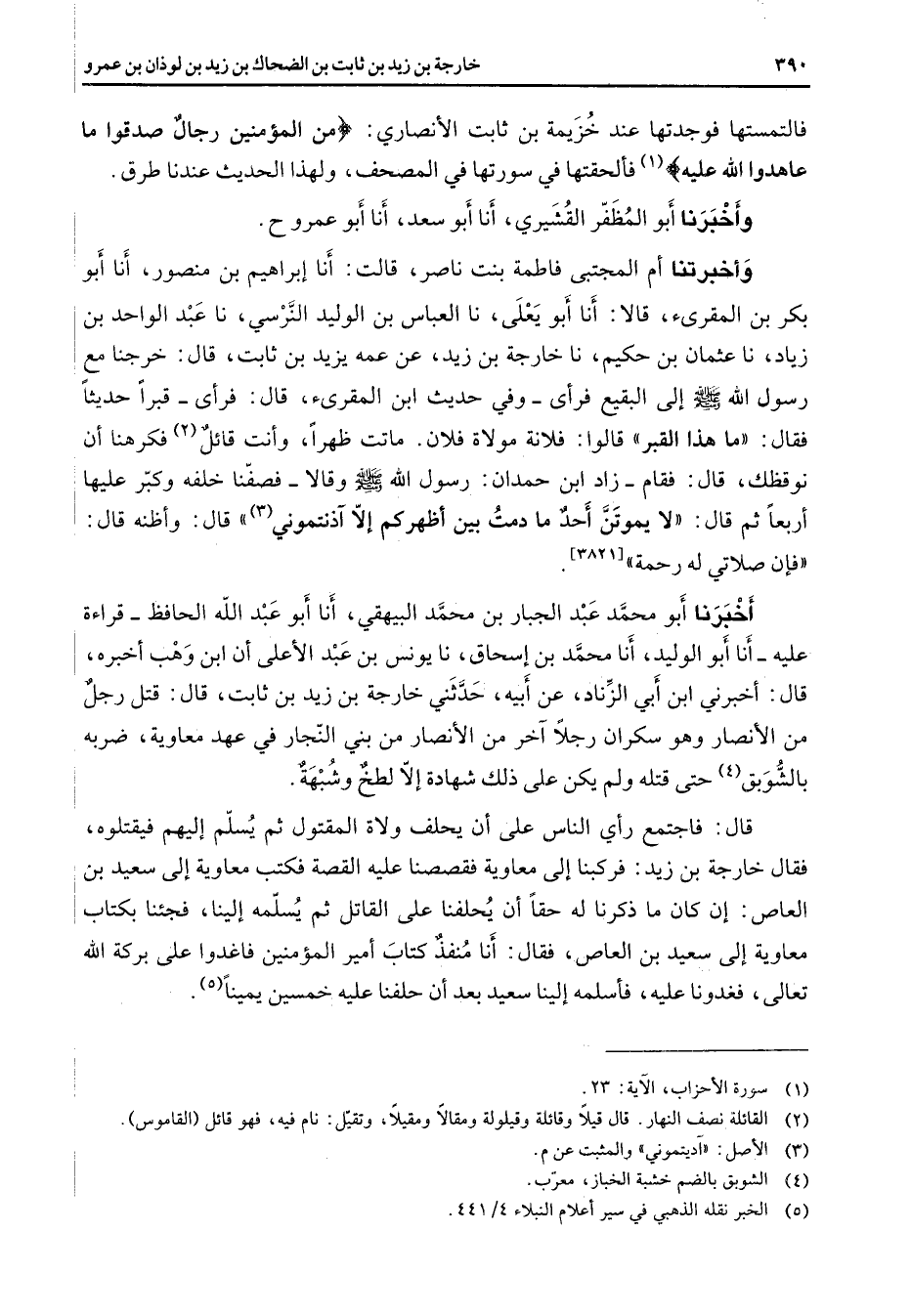فالتمستها فوجدتها عند خزيمة بن ثابت الأنصاري " من المؤمنين رجال صدقوا ما عاهدوا الله عليه " (1) فألحقتها في سورتها في المصحف ولهذا الحديث عندنا طرق وأخبرنا أبو المظفر القشيري أنا أبو سعد أنا أبو عمرو ح وأخبرتنا أم المجتبى فاطمة بنت ناصر قالت أنا إبراهيم بن منصور أنا أبو بكر بن المقرئ قالا أنا أبو يعلى نا العباس بن الوليد النرسي نا عبد الواحد بن زياد نا عثمان بن حكيم نا خارجة بن زيد عن عمه يزيد بن ثابت قال خرجنا مع رسول الله (صلى الله عليه وسلم) إلى البقيع فرأى وفي حديث ابن المقرئ قال فرأى قبرا حديثا فقال ما هذا القبر قالوا فلانة مولاة فلان ماتت ظهرا وأنت قائل (2) فكرهنا أن نوقظك قال فقام زاد ابن حمدان رسول الله (صلى الله عليه وسلم) وقالا فصفنا خلفه وكبر عليها أربعا ثم قال لا يموتن أحد ما دمت بين أظهركم إلا آذنتموني ح (3) قال وأظنه قال فإن صلاتي له رحمة (3821) أخبرنا أبو محمد عبد الجبار بن محمد البيهقي أنا أبو عبد الله الحافظ قراءة عليه أنا أبو الوليد أنا محمد بن إسحاق نا يونس بن عبد الأعلى أن ابن وهب أخبره قال أخبرني ابن أبي الزناد عن أبيه حدثني خارجة بن زيد بن ثابت قال قتل رجل من الأنصار وهو سكران رجلا آخر من الأنصار من بني النجار في عهد معاوية ضربه بالشوبق (4) حتى قتله ولم يكن على ذلك شهادة إلا لطخ وشبهة قال فاجتمع رأي الناس على أن يحلف ولاة المقتول ثم يسلم إليهم فيقتلوه فقال خارجة بن زيد فركبنا إلي معاوية فقصصنا عليه القصة فكتب معاوية إلى سعيد بن العاص إن كان ما ذكرنا له حقا أن يحلفنا على القاتل ثم يسلمه إلينا فجئنا بكتاب معاوية إلى سعيد بن العاص فقال أنا منفذ كتاب أمير المؤمنين فاغدوا على بركة الله تعالى فغدونا عليه فأسلمه إلينا سعيد بعد أن حلفنا عليه خمسين يمينا (5)