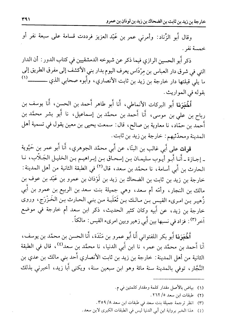وقال أبو الزناد وأمرني عمر بن عبد العزيز فرددت قسامة على سبعة نفر أو خمسة نفر ذكر أبو الحسين الرازي فيما ذكر عن شيوخه الدمشقيين في كتاب الدور أن الدار التي في شرق دار العباس بن مرداس يعرف اليوم بدار بني الأكشف إلى مفرق الطريق إلى ما يلي قبلتها دار خارجة بن زيد بن ثابت الأنصاري وأبوه صحابي الذي (1) يقوله في المواريث أخبرنا أبو البركات الأنماطي أنا أبو طاهر أحمد بن الحسن أنا يوسف بن رباح بن علي بن موسى أنا أحمد بن محمد بن إسماعيل نا أبو بشر محمد بن أحمد بن حماد نا معاوية بن صالح قال سمعت يحيى بن معين يقول في تسمية أهل المدينة ومحدثيهم خارجة بن زيد بن ثابت قرأت على أبي غالب بن البنا عن أبي محمد الجوهري أنا أبو عمر بن حيوية إجازة أنا أبو أيوب سليمان بن إسحاق بن إبراهيم بن الخليل الجلاب نا الحارث بن أبي أسامة نا محمد بن سعد قال (2) في الطبقة الثانية من أهل المدينة خارجة بن زيد بن ثابت بن الضحاك بن زيد بن لوذان بن عمرو بن عبد بن عوف بن مالك بن النجار وأمه أم سعد وهي جميلة بنت سعد بن الربيع بن عمرو بن أبي زهير بن امرئ القيس بن مالك بن ثعلبة من بني الحارث بن الخزرج وروى خارجة بن زيد عن أبيه وكان كثير الحديث ذكر ابن سعد أم خارجة في موضع آخر (3) فزاد في نسبها بين أبي زهير وبين امرئ القيس مالكا أخبرنا أبو بكر اللفتواني أنا أبو عمرو بن مندة أنا الحسن بن محمد بن يوسف أنا أحمد بن محمد بن عمر نا ابن أبي الدنيا نا محمد بن سعد (4) قال في الطبقة الثانية من أهل المدينة خارجة بن زيد بن ثابت الأنصاري أحد بني مالك بن عدي بن النجار توفي بالمدينة سنة مائة وهو ابن سبعين سنة ويكنى أبا زيد أخبرني بذلك