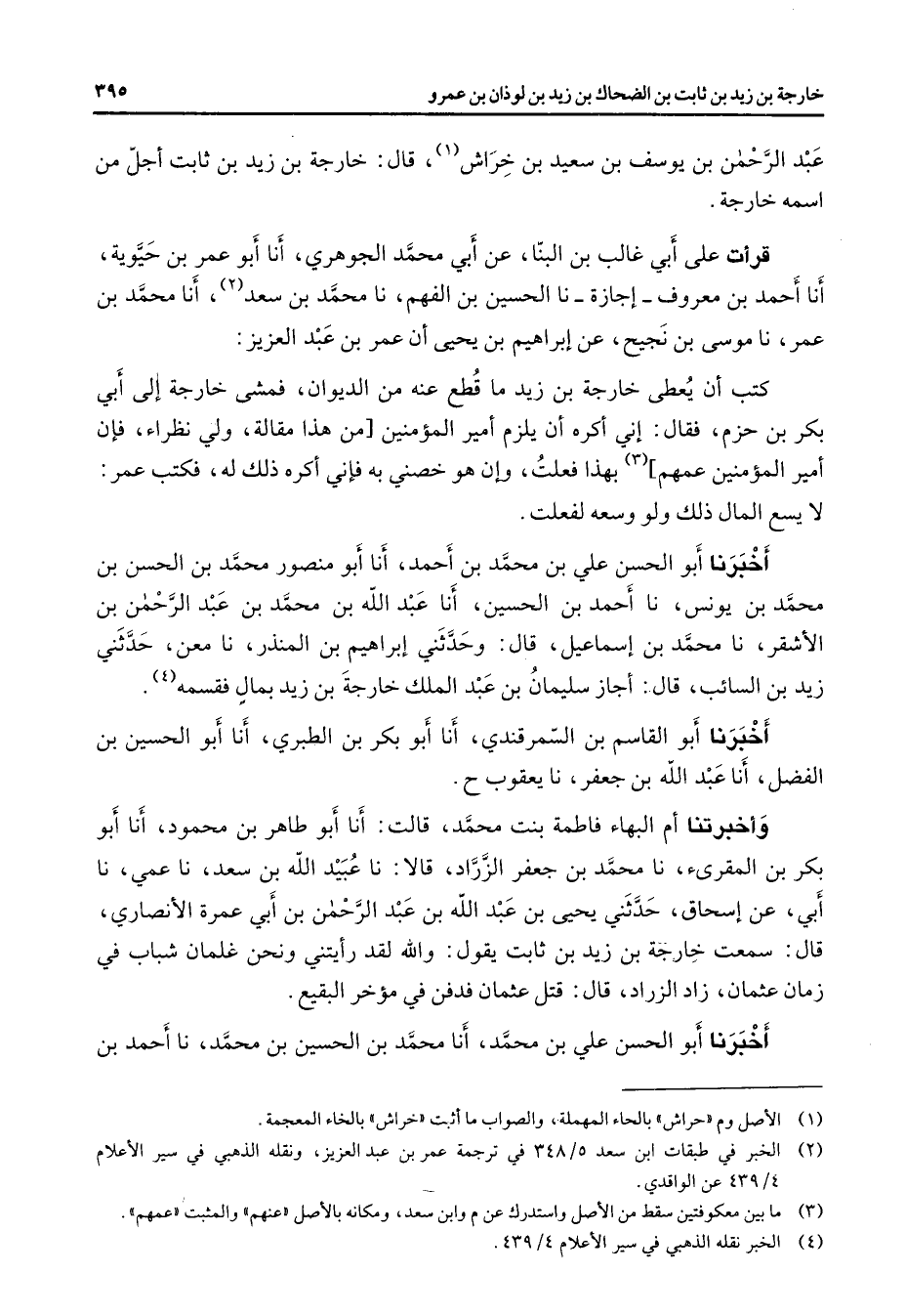 عبد الرحمن بن يوسف بن سعيد بن خراش (1) قال خارجة بن زيد بن ثابت أجل من اسمه خارجة قرأت على أبي غالب بن البنا عن أبي محمد الجوهري أنا أبو عمر بن حيوية أنا أحمد بن معروف إجازة نا الحسين بن الفهم نا محمد بن سعد (2) أنا محمد بن عمر نا موسى بن نجيح عن إبراهيم بن يحيى أن عمر بن عبد العزيز كتب أن يعطى خارجة بن زيد ما قطع عنه من الديوان فمشى خارجة إلى أبي بكر بن حزم فقال إني أكره أن يلزم أمير المؤمنين من هذا مقالة ولي نظراء فإن أمير المؤمنين عمهم (3) بهذا فعلت وإن هو خصني به فإني أكره ذلك له فكتب عمر لا يسع المال ذلك ولو وسعه لفعلت أخبرنا أبو الحسن علي بن محمد بن أحمد أنا أبو منصور محمد بن الحسن بن محمد بن يونس نا أحمد بن الحسين أنا عبد الله بن محمد بن عبد الرحمن بن الأشقر نا محمد بن إسماعيل قال وحدثني إبراهيم بن المنذر نا معن حدثني زيد بن السائب قال أجاز سليمان بن عبد الملك خارجة بن زيد بمال فقسمه (4) أخبرنا أبو القاسم بن السمرقندي أنا أبو بكر بن الطبري أنا أبو الحسين بن الفضل أنا عبد الله بن جعفر نا يعقوب ح وأخبرتنا أم البهاء فاطمة بنت محمد قالت أنا أبو طاهر بن محمود أنا أبو بكر بن المقرئ نا محمد بن جعفر الزراد قالا نا عبيد الله بن سعد نا عمي نا أبي عن إسحاق حدثني يحيى بن عبد الله بن عبد الرحمن بن أبي عمرة الأنصاري قال سمعت خارجة بن زيد بن ثابت يقول والله لقد رأيتني ونحن غلمان شباب في زمان عثمان زاد الزراد قال قتل عثمان فدفن في مؤخر البقيع أخبرنا أبو الحسن علي بن محمد أنا محمد بن الحسين بن محمد نا أحمد بن
