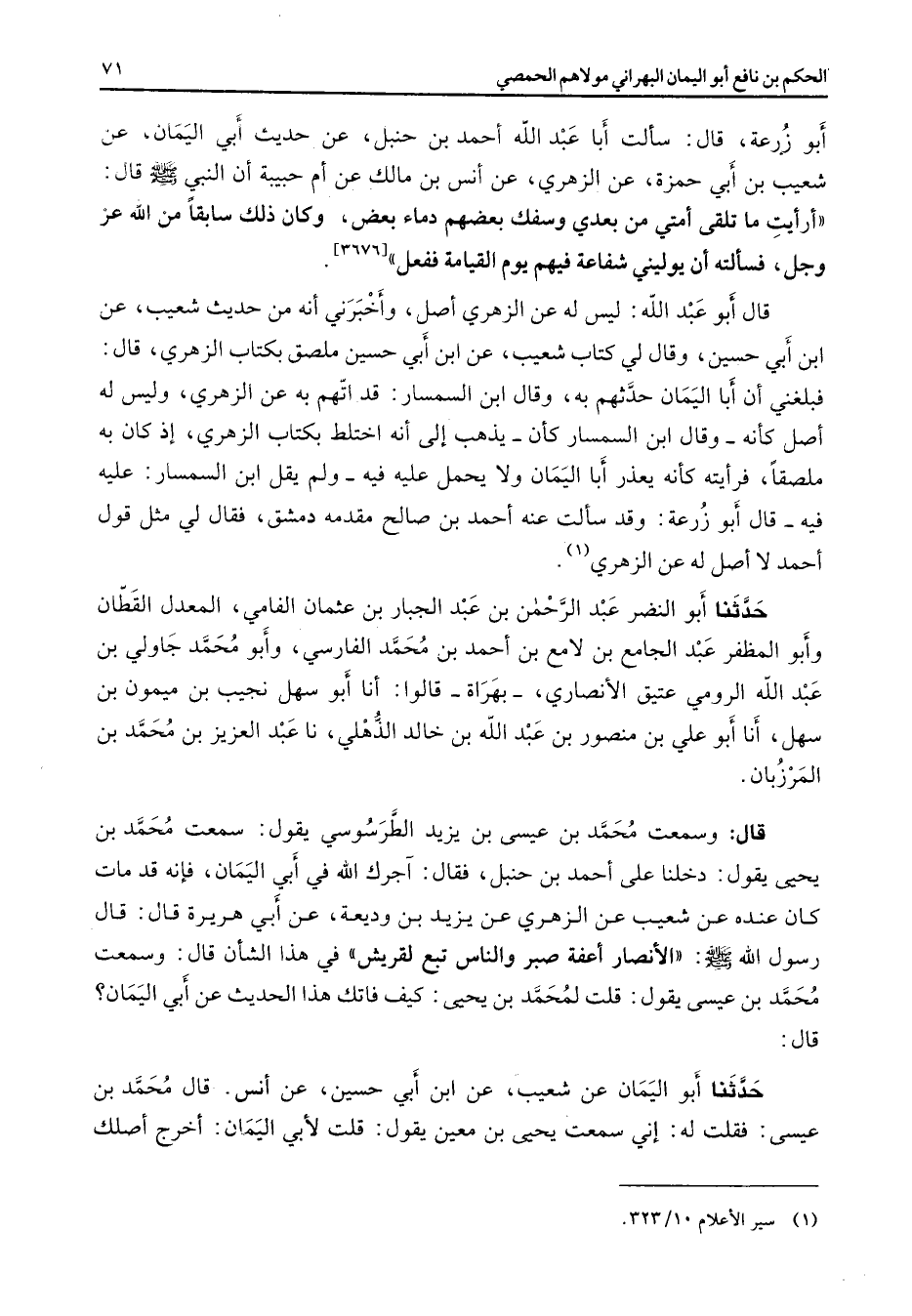 أبو زرعة قال سألت أبا عبد الله أحمد بن حنبل عن حديث أبي اليمان عن شعيب بن أبي حمزة عن الزهري عن أنس بن مالك عن أم حبيبة أن النبي (صلى الله عليه وسلم) قال أرأيت ما تلقى أمتي من بعدي وسفك بعضهم دماء بعض وكان ذلك سابقا من الله عز وجل فسألته أن يوليني شفاعة فيهم يوم القيامة ففعل (3676) قال أبو عبد الله ليس له عن الزهري أصل وأخبرني أنه من حديث شعيب عن ابن أبي حسين وقال لي كتاب شعيب عن ابن أبي حسين ملصق بكتاب الزهري قال فبلغني أن أبا اليمان حدثهم به وقال ابن السمسار قد اتهم به عن الزهري وليس له أصل كأنه وقال ابن السمسار كأن يذهب إلى أنه اختلط بكتاب الزهري إذ كان به ملصقا فرأيته كأنه يعذر أبا اليمان ولا يحمل عليه فيه ولم يقل ابن السمسار عليه فيه قال أبو زرعة وقد سألت عنه أحمد بن صالح مقدمه دمشق فقال لي مثل قول أحمد لا أصل له عن الزهري (1) حدثنا أبو النضر عبد الرحمن بن عبد الجبار بن عثمان الفامي المعدل القطان وأبو المظفر عبد الجامع بن لامع بن أحمد بن محمد الفارسي وأبو محمد جاولي بن عبد الله الرومي عتيق الأنصاري بهراة قالوا أنا أبو سهل نجيب بن ميمون بن سهل أنا أبو علي بن منصور بن عبد الله بن خالد الذهلي نا عبد العزيز بن محمد بن المرزبان قال وسمعت محمد بن عيسى بن يزيد الطرسوسي يقول سمعت محمد بن يحيى يقول دخلنا على أحمد بن حنبل فقال آجرك الله في أبي اليمان فإنه قد مات كان عنده عن شعيب عن الزهري عن يزيد بن وديعة عن أبي هريرة قال قال رسول الله (صلى الله عليه وسلم) الأنصار أعفة صبر والناس تبع لقريش في هذا الشأن قال وسمعت محمد بن عيسى يقول قلت لمحمد بن يحيى كيف فاتك هذا الحديث عن أبي اليمان قال حدثنا أبو اليمان عن شعيب عن ابن أبي حسين عن أنس قال محمد بن عيسى فقلت له إني سمعت يحيى بن معين يقول قلت لأبي اليمان أخرج أصلك
