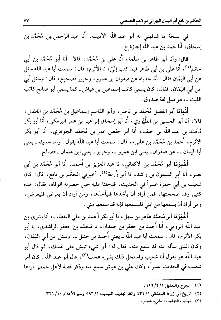 في نسخة ما شافهني به أبو عبد الله الأديب أنا عبد الرحمن بن محمد بن إسحاق أنا حمد بن عبد الله إجازة ح قال وأنا أبو طاهر بن سلمة أنا علي بن محمد قالا أنا أبو محمد بن أبي حاتم (1) أنا علي بن أبي طاهر فيما كتب إلي نا الأثرم قال سمعت أبا عبد الله سئل عن أبي اليمان فقال أما حديثه عن صفوان بن عمرو وحريز فصحيح قال وسئل أبي عن أبي اليمان فقال كان يسمى كاتب إسماعيل بن عياش كما يسمى أبو صالح كاتب الليث وهو نبيل ثقة صدوق أنبأنا أبو الفضل محمد بن ناصر وأبو القاسم إسماعيل بن محمد بن الفضل قالا أنا أبو الحسين بن الطيوري أنا أبو إسحاق إبراهيم بن عمر البرمكي أنا أبو بكر محمد بن عبد الله بن خلف أنا أبو حفص عمر بن محمد الجوهري أنا أبو بكر الأثرم أحمد بن محمد بن هانئ قال سمعت أبا عبد الله يقول وأما حديثه يعني أبا اليمان عن صفوان يعني ابن عمرو وحريز يعني ابن عثمان فصالح أخبرنا أبو محمد بن الأكفاني نا عبد العزيز بن أحمد أنا أبو محمد بن أبي نصر أنا أبو الميمون بن راشد نا أبو زرعة (2) أخبرني الحكم بن نافع قال كان شعيب بن أبي حمزة عسرا في الحديث فدخلنا عليه حين حضرته الوفاة فقال هذه كتبي وقد صححتها فمن أراد أن يأخذها فليأخذها ومن أراد أن يعرض فليعرض ومن أراد أن يسمعها من ابني فليسمعها فإنه قد سمعها مني أخبرنا أبو محمد طاهر بن سهل نا أبو بكر أحمد بن علي الخطاب أنا بشرى بن عبد الله الرومي أنا أحمد بن جعفر بن حمدان نا محمد بن جعفر الراشدي نا أبو بكر الأثرم قال سمعت أبا عبد الله يعني أحمد بن حنبل وسئل عن أبي اليمان وكان الذي سأله عنه قد سمع منه فقال له أي شئ تنبش على نفسك ثم قال أبو عبد الله هو يقول أنا شعيب واستحل ذلك بشئ عجب قال أبو عبد الله كان أمر شعيب في الحديث عسرا وكان علي بن عياش سمع منه وذكر قصة لأهل حمص أراها