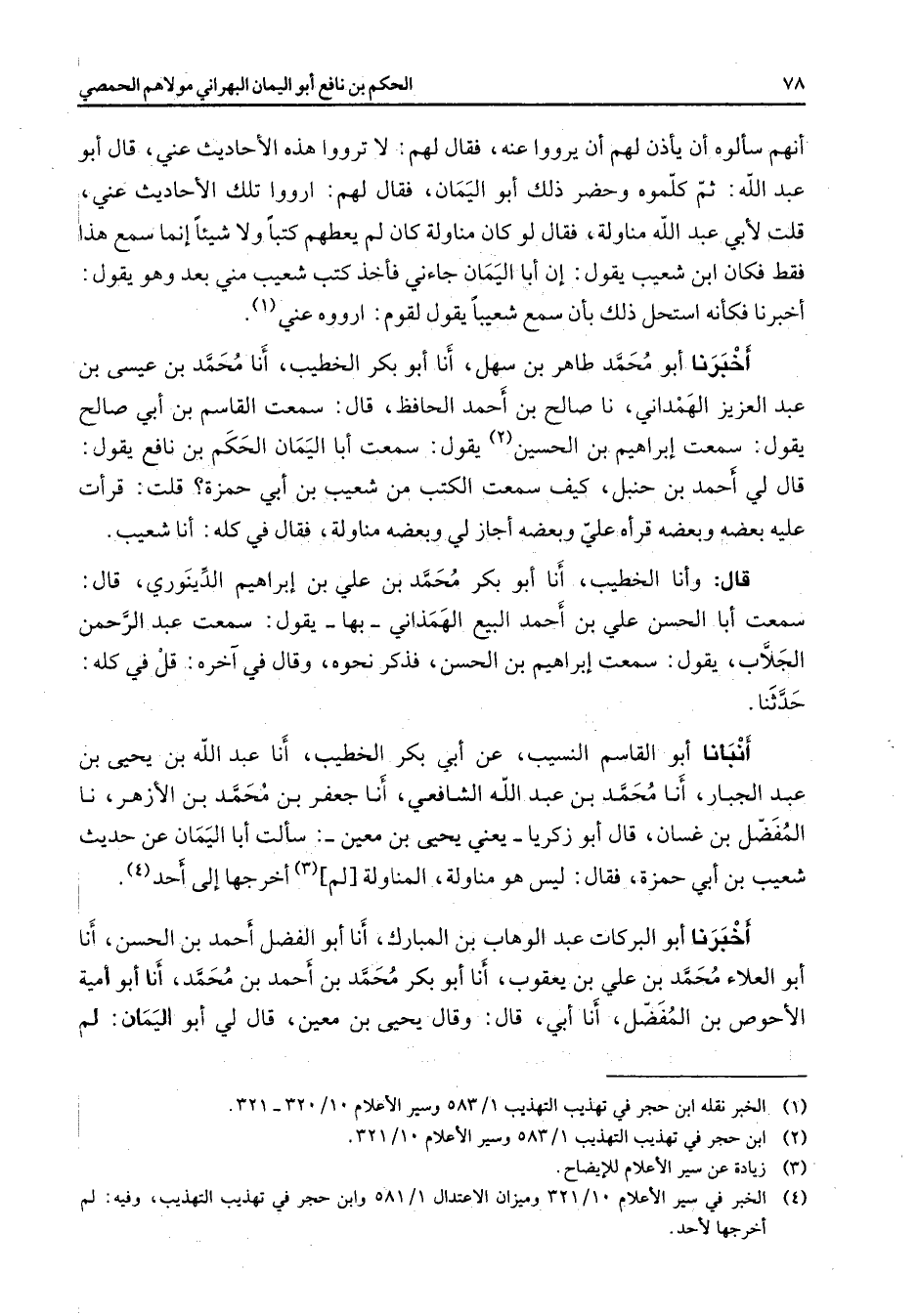 أنهم سألوه أن يأذن لهم أن يرووا عنه فقال لهم لا ترووا هذه الأحاديث عني قال أبو عبد الله ثم كلموه وحضر ذلك أبو اليمان فقال لهم ارووا تلك الأحاديث عني قلت لأبي عبد الله مناولة فقال لو كان مناولة كان لم يعطهم كتبا ولا شيئا إنما سمع هذا فقط فكان ابن شعيب يقول إن أبا اليمان جاءني فأخذ كتب شعيب مني بعد وهو يقول أخبرنا فكأنه استحل ذلك بأن سمع شعيبا يقول لقوم ارووه عني (1) أخبرنا أبو محمد طاهر بن سهل أنا أبو بكر الخطيب أنا محمد بن عيسى بن عبد العزيز الهمداني نا صالح بن أحمد الحافظ قال سمعت القاسم بن أبي صالح يقول سمعت إبراهيم بن الحسين (2) يقول سمعت أبا اليمان الحكم بن نافع يقول قال لي أحمد بن حنبل كيف سمعت الكتب من شعيب بن أبي حمزة قلت قرأت عليه بعضه وبعضه قرأه علي وبعضه أجاز لي وبعضه مناولة فقال في كله أنا شعيب قال وأنا الخطيب أنا أبو بكر محمد بن علي بن إبراهيم الدينوري قال سمعت أبا الحسن علي بن أحمد البيع الهمذاني بها يقول سمعت عبد الرحمن الجلاب يقول سمعت إبراهيم بن الحسن فذكر نحوه وقال في آخره قل في كله حدثنا أنبانا أبو القاسم النسيب عن أبي بكر الخطيب أنا عبد الله بن يحيى بن عبد الجبار أنا محمد بن عبد الله الشافعي أنا جعفر بن محمد بن الأزهر نا المفضل بن غسان قال أبو زكريا يعني يحيى بن معين سألت أبا اليمان عن حديث شعيب بن أبي حمزة فقال ليس هو مناولة المناولة (لم) (3) أخرجها إلى أحد (4) أخبرنا أبو البركات عبد الوهاب بن المبارك أنا أبو الفضل أحمد بن الحسن أنا أبو العلاء محمد بن علي بن يعقوب أنا أبو بكر محمد بن أحمد بن محمد أنا أبو أمية الأحوص بن المفضل أنا أبي قال وقال يحيى بن معين قال لي أبو اليمان لم