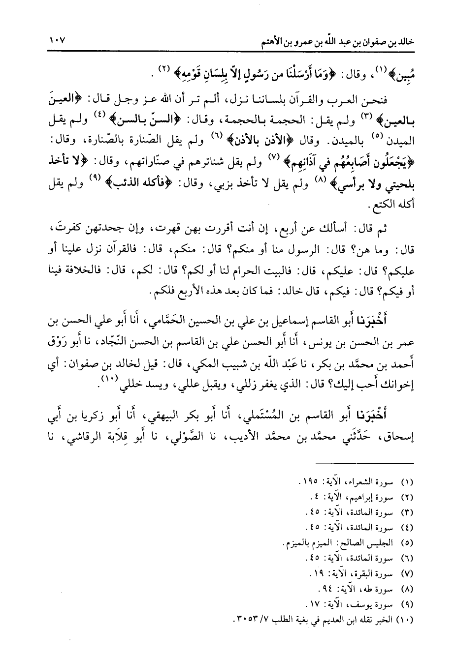 " " مبين " (1) وقال " وما أرسلنا من رسول إلا بلسان قومه " (2) فنحن العرب والقرآن بلساننا نزل ألم تر أن الله عز وجل قال " العين بالعين " (3) ولم يقل الحجمة بالحجمة وقال " السن بالسن " (4) ولم يقل بالمدن (5) بالمدين وقال " الأذن بالأذن (6) " ولم يقل الصنارة بالصنارة وقال " يجعلون أصابعهم في آذانهم " (7) ولم يقل شناترهم في صناراتهم وقال " لا تأخذ بلحيتي ولا برأسي " (8) ولم يقل لا تأخذ بزبي وقال " فأكله الذئب " (9) ولم يقل أكله الكتع ثم قال أسألك عن أربع إن أنت أقررت بهن قهرت وإن جحدتهن كفرت قال وما هن قال الرسول منا أو منكم قال منكم قال فالقرآن نزل علينا أو عليكم قال عليكم قال فالبيت الحرام لنا أو لكم قال لكم قال فالخلافة فينا أو فيكم قال فيكم قال خالد فما كان بعد هذه الأربع فلكم أخبرنا أبو القاسم إسماعيل بن علي بن الحسين الحمامي أنا أبو علي الحسن بن عمر بن الحسن بن يونس أنا أبو الحسن علي بن القاسم بن الحسن النجاد نا أبو روق أحمد بن محمد بن بكر نا عبد الله بن شبيب المكي قال قيل لخالد بن صفوان أي إخوانك أحب إليك قال الذي يغفر زللي ويقبل عللي ويسد خللي (10) أخبرنا أبو القاسم بن المستملي أنا أبو بكر البيهقي أنا أبو زكريا بن أبي إسحاق حدثني محمد بن محمد الأديب نا الصولي نا أبو قلابة الرقاشي نا