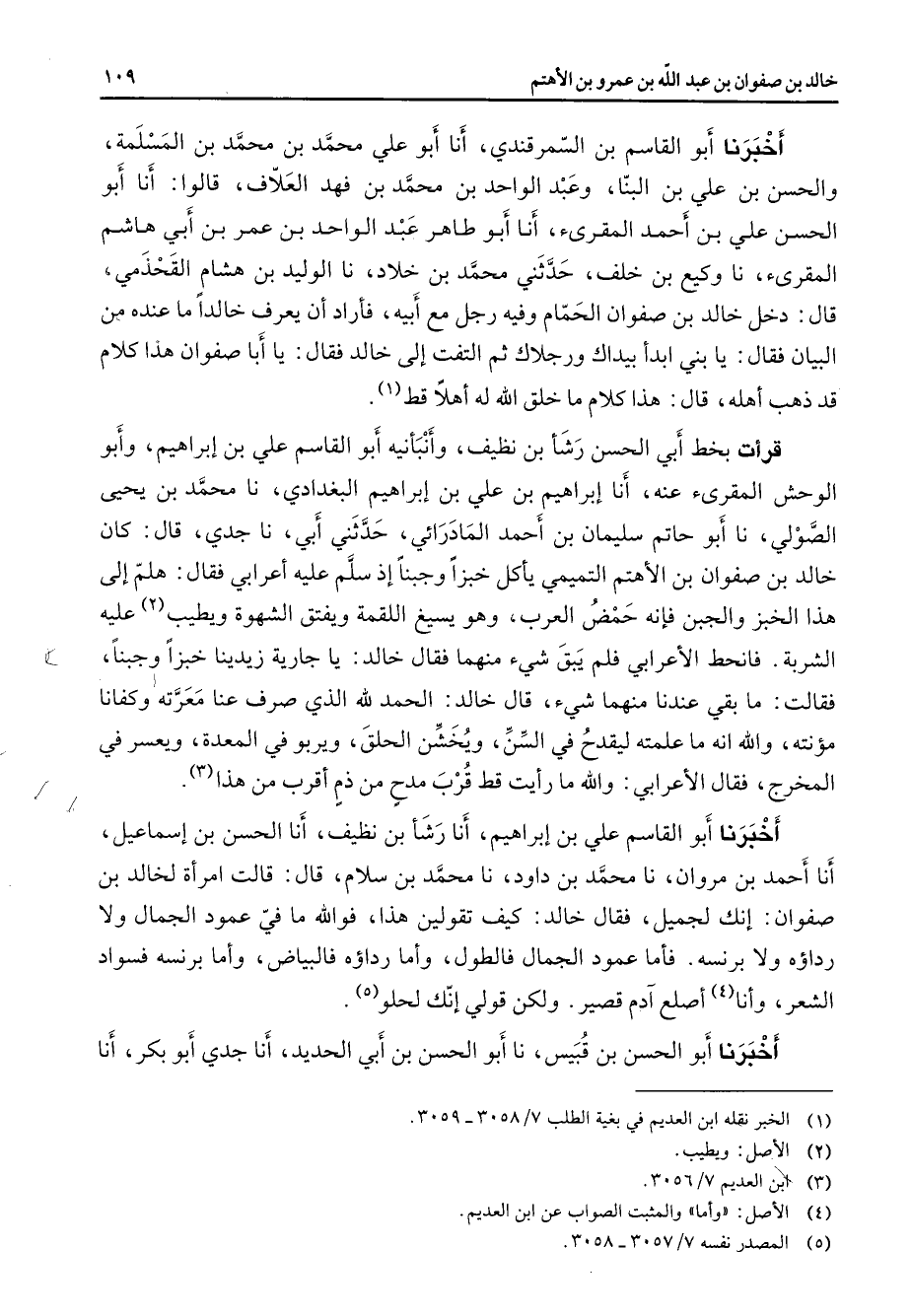 أخبرنا أبو القاسم بن السمرقندي أنا أبو علي محمد بن محمد بن المسلمة والحسن بن علي بن البنا وعبد الواحد بن محمد بن فهد العلاف قالوا أنا أبو الحسن علي بن أحمد المقرئ أنا أبو طاهر عبد الواحد بن عمر بن أبي هاشم المقرئ نا وكيع بن خلف حدثني محمد بن خلاد نا الوليد بن هشام القحذمي قال دخل خالد بن صفوان الحمام وفيه رجل مع أبيه فأراد أن يعرف خالدا ما عنده من البيان فقال يا بني ابدأ بيداك ورجلاك ثم التفت إلى خالد فقال يا أبا صفوان هذا كلام قد ذهب أهله قال هذا كلام ما خلق الله له أهلا قط (1) قرأت بخط أبي الحسن رشأ بن نظيف وأنبأنيه أبو القاسم علي بن إبراهيم وأبو الوحش المقرئ عنه أنا إبراهيم بن علي بن إبراهيم البغدادي نا محمد بن يحيى الصولي نا أبو حاتم سليمان بن أحمد المادرائي حدثني أبي نا جدي قال كان خالد بن صفوان بن الأهتم التميمي يأكل خبزا وجبنا إذ سلم عليه أعرابي فقال هلم إلى هذا الخبز والجبن فإنه حمض العرب وهو يسيغ اللقمة ويفتق الشهوة ويطيب (2) عليه الشربة فانحط الأعرابي فلم يبق شئ منهما فقال خالد يا جارية زيدينا خبزا وجبنا فقالت ما بقي عندنا منهما شئ قال خالد الحمد لله الذي صرف عنا معرته وكفانا مؤنته والله إنه ما علمته ليقدح في السن ويخشن الحلق ويربو في المعدة ويعسر في المخرج فقال الأعرابي والله ما رأيت قط قرب مدح من ذم أقرب من هذا (3) أخبرنا أبو القاسم علي بن إبراهيم أنا رشأ بن نظيف أنا الحسن بن إسماعيل أنا أحمد بن مروان نا محمد بن داود نا محمد بن سلام قال قالت امرأة لخالد بن صفوان إنك لجميل فقال خالد كيف تقولين هذا فوالله ما في عمود الجمال ولا رداؤه ولا برنسه فأما عمود الجمال فالطول وأما رداؤه فالبياض وأما برنسه فسواد الشعر وأنا (4) أصلع آدم قصير ولكن قولي إنك لحلو (5) أخبرنا أبو الحسن بن قبيس نا أبو الحسن بن أبي الحديد أنا جدي أبو بكر أنا