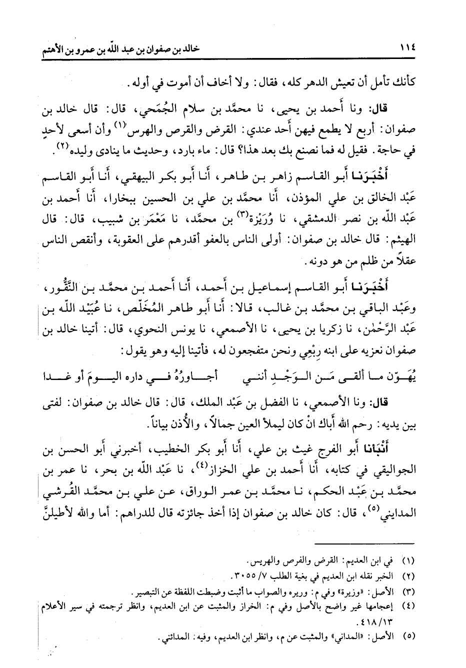 كأنك تأمل أن تعيش الدهر كله فقال ولا أخاف أن أموت في أوله قال ونا أحمد بن يحيى نا محمد بن سلام الجمحي قال قال خالد بن صفوان أربع لا يطمع فيهن أحد عندي القرض والقرص والهرس (1) وأن أسعى لأحد في حاجة فقيل له ما نصنع بك بعد هذا قال ماء بارد وحديث ما ينادى وليده (2) أخبرنا أبو القاسم زاهر بن طاهر أنا أبو بكر البيهقي أنا أبو القاسم عبد الخالق بن علي المؤذن أنا محمد بن علي بن الحسين ببخارا أنا أحمد بن عبد الله بن نصر الدمشقي نا وريزة (3) بن محمد نا معمر بن شبيب قال قال الهيثم قال خالد بن صفوان أولى الناس بالعفو أقدرهم على العقوبة وأنقص الناس عقلا من ظلم من هو دونه أخبرنا أبو القاسم إسماعيل بن أحمد أنا أحمد بن محمد بن النقور وعبد الباقي بن محمد بن غالب قالا أنا أبو طاهر المخلص نا عبيد الله بن عبد الرحمن نا زكريا بن يحيى نا الأصمعي نا يونس النحوي قال أتينا خالد بن صفوان نعزيه على ابنه ربعي ونحن متفجعون له فأتينا إليه وهو يقول * يهون ما ألقى من الوجد أنني * أجاوره في داره اليوم أو غدا * قال ونا الأصمعي نا الفضل بن عبد الملك قال قال خالد بن صفوان لفتى بين يديه رحم الله أباك أن كان ليملأ العين جمالا والأذن بيانا أنبأنا أبو الفرج غيث بن علي أنا أبو بكر الخطيب أخبرني أبو الحسن بن الجواليقي في كتابه أنا أحمد بن علي الخزاز (4) نا عبد الله بن بحر نا عمر بن أحمد بن عبد الحكم نا محمد بن عمر الوراق عن علي بن محمد القرشي المدايني قال كان خالد بن صفوان إذا أخذ جائزته قال للدراهم أما والله لأطيلن