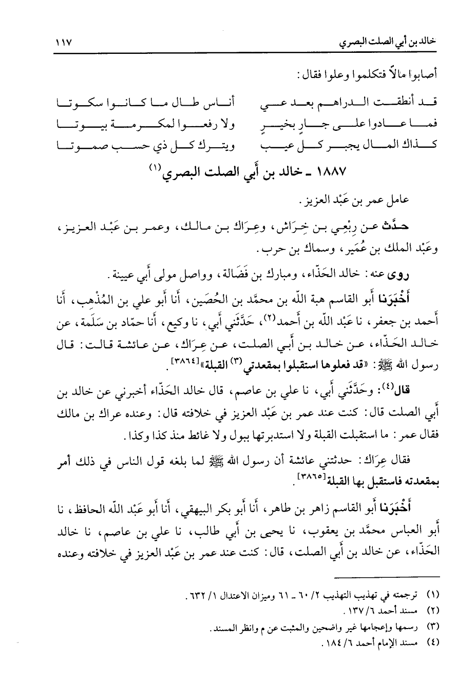 1887 - خالد بن أبي الصلت البصري (1) عامل عمر بن عبد العزيز حدث عن ربعي بن خراش وعراك بن مالك وعمر بن عبد العزيز وعبد الملك بن عمير وسماك بن حرب روى عنه خالد الحذاء ومبارك بن فضالة وواصل مولى أبي عيينة أخبرنا أبو القاسم هبة الله بن محمد بن الحصين أنا أبو علي بن المذهب أنا أحمد بن جعفر نا عبد الله بن أحمد (2) حدثني أبي نا وكيع أنا حماد بن سلمة عن خالد الحذاء عن خالد بن أبي الصلت عن عراك عن عائشة قالت قال رسول الله (صلى الله عليه وسلم) قد فعلوها استقبلوا بمقعدتي (3) القبلة قال (4) وحدثني أبي نا علي بن عاصم قال خالد الحذاء أخبرني عن خالد بن أبي الصلت قال كنت عند عمر بن عبد العزيز في خلافته قال وعنده عراك بن مالك فقال عمر ما استقبلت القبلة ولا استدبرتها ببول ولا غائط منذ كذا وكذا فقال عراك حدثتني عائشة أن رسول الله (صلى الله عليه وسلم) لما بلغه قول الناس في ذلك أمر بمقعدته فاستقبل بها القبلة أخبرنا أبو القاسم زاهر بن طاهر أنا أبو بكر البيهقي أنا أبو عبد الله الحافظ نا أبو العباس محمد بن يعقوب نا يحيى بن أبي طالب نا علي بن عاصم نا خالد الحذاء عن خالد بن أبي الصلت قال كنت عند عمر بن عبد العزيز في خلافته وعنده