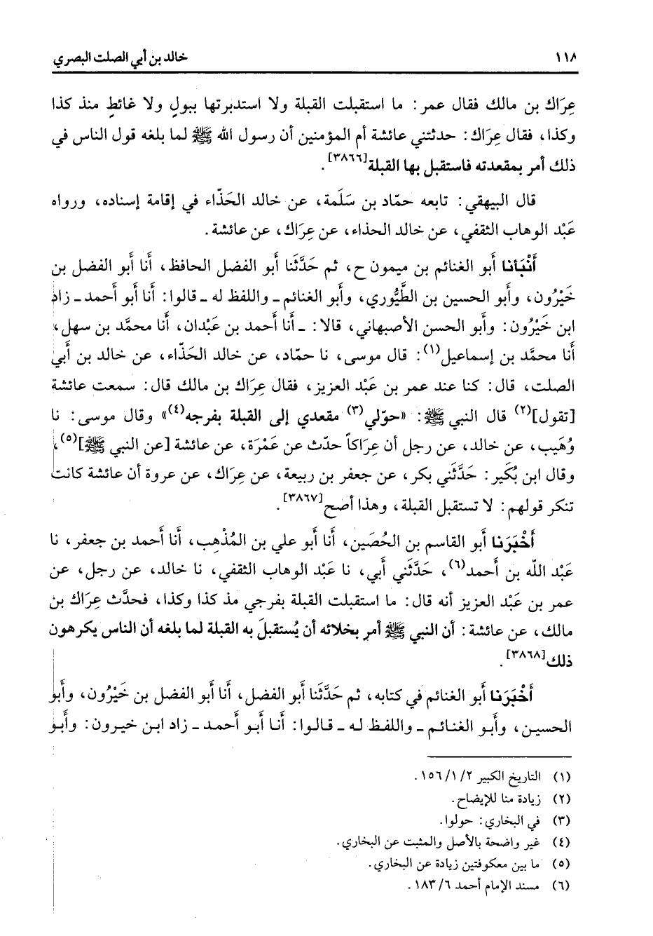 عراك بن مالك فقال عمر ما استقبلت القبلة ولا استدبرتها ببول ولا غائط منذ كذا وكذا فقال عراك حدثتني عائشة أم المؤمنين أن رسول الله (صلى الله عليه وسلم) لما بلغه قول الناس في ذلك أمر بمقعدته فاستقبل بها القبلة قال البيهقي تابعه حماد بن سلمة عن خالد الحذاء في إقامة إسناده ورواه عبد الوهاب الثقفي عن خالد الحذاء عن عراك عن عائشة أنبأنا أبو الغنائم بن ميمون ثم حدثنا أبو الفضل الحافظ أنا أبو الفضل بن خيرون وأبو الحسين بن الطيوري وأبو الغنائم واللفظ له قالوا أنا أبو أحمد زاد ابن خيرون وأبو الحسن الأصبهاني قالا أنا أحمد بن عبدان أنا محمد بن سهل أنا محمد بن إسماعيل (1) قال موسى نا حماد عن خالد الحذاء عن خالد بن أبي الصلت قال كنا عند عمر بن عبد العزيز فقال عراك بن مالك قال سمعت عائشة تقول (2) قال النبي (صلى الله عليه وسلم) حولي (3) مقعدي إلى القبلة بفرجه (4) وقال موسى نا وهيب عن خالد عن رجل أن عراكا حدث عن عمرة عن عائشة عن النبي (صلى الله عليه وسلم) (5) وقال ابن بكير حدثني بكر عن جعفر بن ربيعة عن عراك عن عروة أن عائشة كانت تنكر قولهم لا تستقبل القبلة وهذ أصح أخبرنا أبو القاسم بن الحصين أنا أبو علي بن المذهب أنا أحمد بن جعفر نا عبد الله بن أحمد (6) حدثني أبي نا عبد الوهاب الثقفي نا خالد عن رجل عن عمر بن عبد العزيز أنه قال ما استقبلت القبلة بفرجي مذ كذا وكذا فحدث عراك بن مالك عن عائشة أن النبي (صلى الله عليه وسلم) أمر بخلائه أن يستقبل به القبلة لما بلغه أن الناس يكرهون ذلك أخبرنا أبو الغنائم في كتابه ثم حدثنا أبو الفضل أنا أبو الفضل بن خيرون وأبو الحسين وأبو الغنائم واللفظ له قالوا أنا أبو أحمد زاد ابن خيرون وأبو