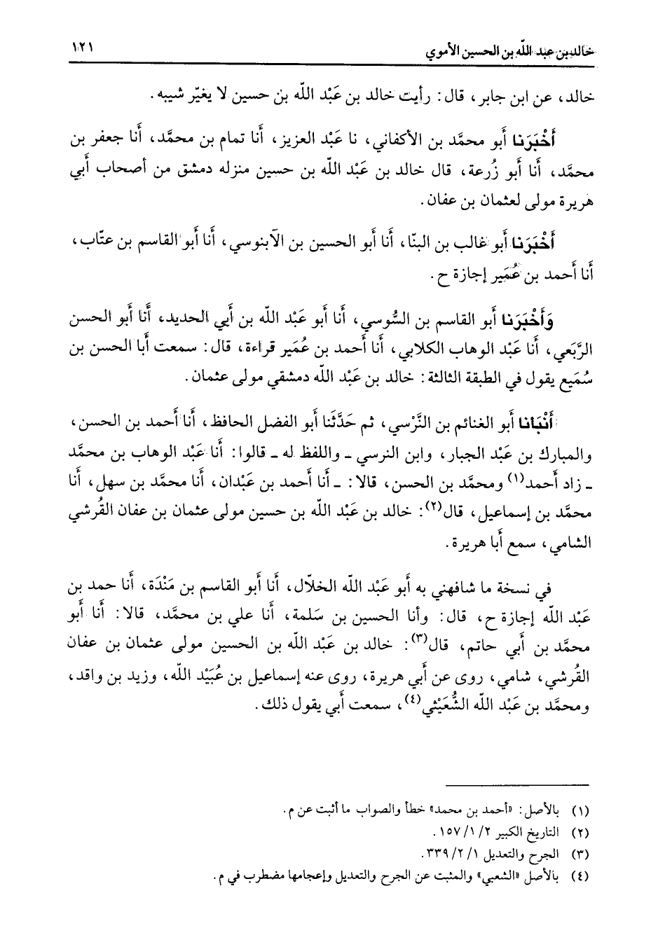 خالد عن ابن جابر قال رأيت خالد بن عبد الله بن حسين لا يغير شيبه أخبرنا أبو محمد بن الأكفاني نا عبد العزيز أنا تمام بن محمد أنا جعفر بن محمد أنا أبو زرعة قال خالد بن عبد الله بن حسين منزله دمشق من أصحاب أبي هريرة مولى لعثمان بن عفان أخبرنا أبو غالب بن البنا أنا أبو الحسين بن الآبنوسي أنا أبو القاسم بن عتاب أنا أحمد بن عمير إجازة وأخبرنا أبو القاسم بن السوسي أنا أبو عبد الله بن أبي الحديد أنا أبو الحسن الربعي أنا عبد الوهاب الكلابي أنا أحمد بن عمير قراءة قال سمعت أبا الحسن بن سميع يقول في الطبقة الثالثة خالد بن عبد الله دمشقي مولى عثمان أنبأنا أبو الغنائم بن النرسي ثم حدثنا أبو الفضل الحافظ أنا أحمد بن الحسن والمبارك بن عبد الجبار وابن النرسي واللفظ له قالوا أنا عبد الوهاب بن محمد زاد أحمد (1) ومحمد بن الحسن قالا أنا أحمد بن عبدان أنا محمد بن سهل أنا محمد بن إسماعيل قال (2) خالد بن عبد الله بن حسين مولى عثمان بن عفان القرشي الشامي سمع أبا هريرة في نسخة ما شافهني به أبو عبد الله الخلال أنا أبو القاسم بن مندة أنا حمد بن عبد الله إجازة قال وأنا الحسين بن سلمة أنا علي بن محمد قالا أنا أبو محمد بن أبي حاتم قال (3) خالد بن عبد الله بن الحسين مولى عثمان بن عفان القرشي شامي روى عن أبي هريرة روى عنه إسماعيل بن عبيد الله وزيد بن واقد ومحمد بن عبد الله الشعيثي (4) سمعت أبي يقول ذلك