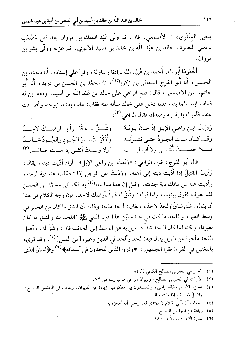 يحيى المنقري نا الأصمعي قال ثم ولى عبد الملك بن مروان بعد قتل مصعب يعني البصرة خالد بن عبد الله بن خالد بن أسيد الأموي ثم عزله وولى بشر بن مروان أخبرنا أبو العز أحمد بن عبيد الله إذنا ومناولة وقرأ علي إسناده أنا محمد بن الحسين أنا أبو الفرج المعافى بن زكريا (1) نا محمد بن الحسن بن دريد أنا أبو حاتم عن الأصمعي قال قدم الراعي على خالد بن عبد الله بن أسيد ومعه ابن له فمات ابنه بالمدينة فلما دخل على خالد سأله عنه فقال مات بعدما زوجته وأصدقت عنه فأمر له بدية ابنه وصداقه فقال الراعي (2) * وديت ابن راعي الإبل إذ حان يومه * وشق له قبرا بأرضك لأحد وقد كان مات الجود حتى نشرته * وأذكيت نار الجود والجود خامد فلا حملت أنثى ولا آب آيب * ولا ولدت أنثى إذا مات خالد (3) * قال أبو الفرج قول الراعي وديت ابن راعي الإبل أراد أديت ديته يقال وديت القتيل إذا أديت ديته إلى أهله ووديت عن الرجل إذا تحملت عنه دية لزمته وأديت عنه من مالك دية جنايته وقيل إن هذا مما عايا (4) به الكسائي محمد بن الحسن فلم يعرف الفرق بينهما وأما قوله وشق له قبرا بأرضك لأحد فإن وجه الكلام في هذا أن يقال شق شاق ولحد لاحد ويقال ألحد ملحد وذلك أن الشق ما كان من الحفر في وسط القبر واللحد ما كان في جانبه بين هذا قول النبي (صلى الله عليه وسلم) اللحد لنا والشق ما كان لغيرنا ولكنه لما كان اللحد شقا قد ميل به عن الوسط إلى الجانب قال وشق له وأصل اللحد مأخوذ من الميل يقال فيه لحد وألحد في الدين وغيره من الميل (5) وقد قرئ باللغتين في القرآن فقرأ الجمهور " وذروا الذين يلحدون في أسمائه " و " لسان الذي