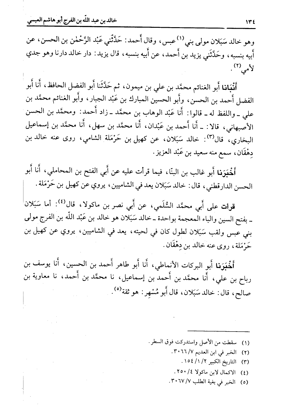 وهو خالد سبلان مولى بني (1) عبس وقال أحمد حدثني عبد الرحمن بن الحسن عن أبيه بنسبه وحدثني يزيد بن أحمد عن أبيه بنسبه قال يزيد دار خالد دارنا وهو جدي لأمي (2) أنبأنا أبو الغنائم محمد بن علي بن ميمون ثم حدثنا أبو الفضل الحافظ أنا أبو الفضل أحمد بن الحسن وأبو الحسين المبارك بن عبد الجبار وأبو الغنائم محمد بن علي واللفظ له قالوا أنا عبد الوهاب بن محمد زاد أحمد ومحمد بن الحسن الأصبهاني قالا أنا أحمد بن عبدان أنا محمد بن سهل أنا محمد بن إسماعيل البخاري قال (3) خالد سبلان عن كهيل بن حرملة الشامي روى عنه خالد بن دهقان سمع منه سعيد بن عبد العزيز أخبرنا أبو غالب بن البنا فيما قرأت عليه عن أبي الفتح بن المحاملي أنا أبو الحسن الدارقطني قال خالد سبلان يعد في الشاميين يروي عن كهيل بن حرملة قرأت على أبي محمد السلمي عن أبي نصر بن ماكولا قال (4) أما سبلان بفتح السين والباء المعجمة بواحدة خالد سبلان هو خالد بن عبد الله بن الفرج مولى بني عبس ولقب سبلان لطول كان في لحيته يعد في الشاميين يروي عن كهيل بن حرملة روى عنه خالد بن دهقان أخبرنا أبو البركات الأنماطي أنا أبو طاهر أحمد بن الحسين أنا يوسف بن رباح بن علي أنا محمد بن أحمد بن إسماعيل نا محمد بن أحمد نا معاوية بن صالح قال خالد سبلان قال أبو مسهر هو ثقة (5)