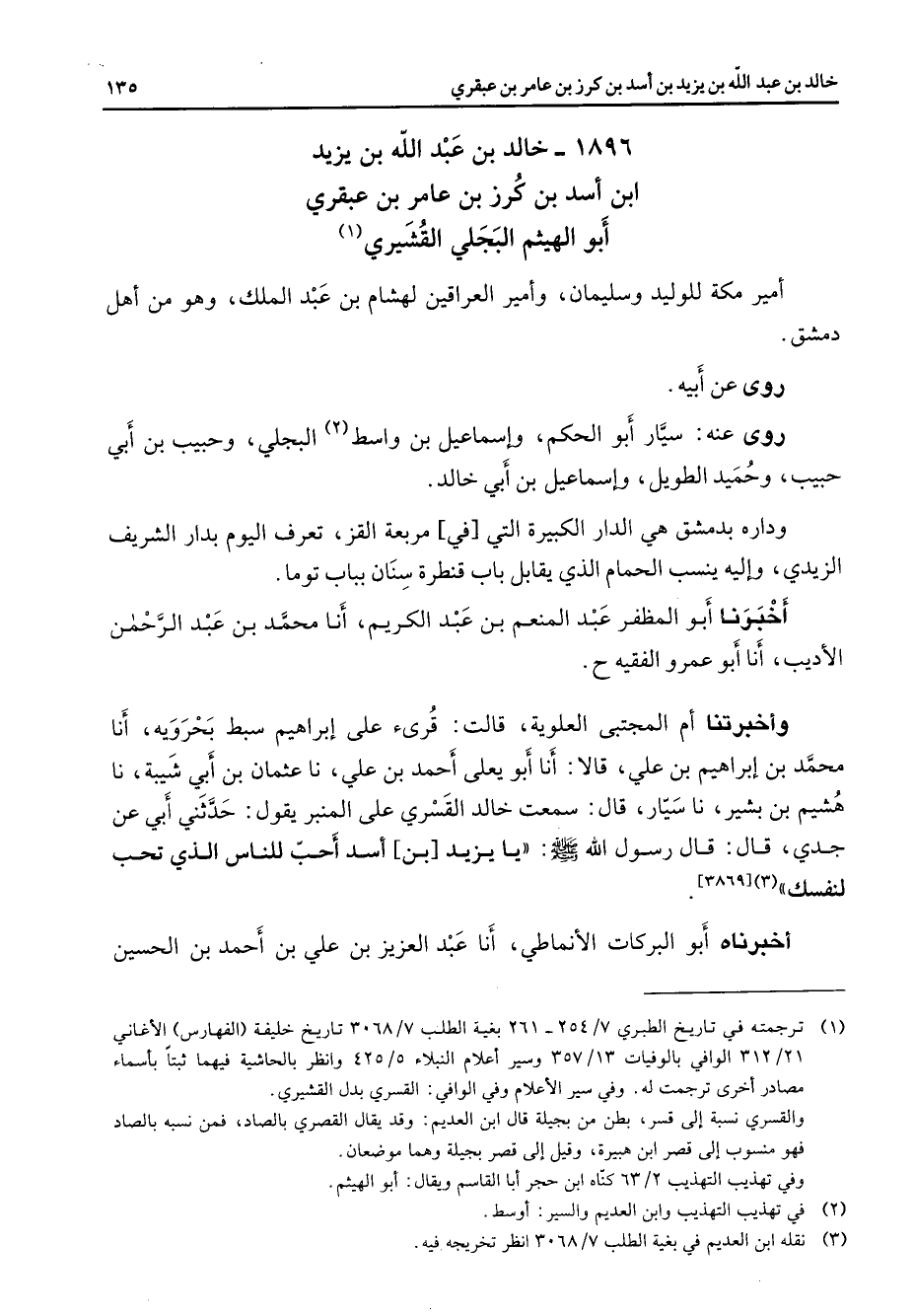 1896 - خالد بن عبد الله بن يزيد ابن أسد بن كرز بن عامر بن عبقري أبو الهيثم البجلي القشيري (1) أمير مكة للوليد وسليمان وأمير العراقين لهشام بن عبد الملك وهو من أهل دمشق روى عن أبيه روى عنه سيار أبو الحكم وإسماعيل بن واسط (3) البجلي وحبيب بن أبي حبيب وحميد الطويل وإسماعيل بن أبي خالد وداره بدمشق هي الدار الكبيرة التي في مربعة القز تعرف اليوم بدار الشريف الزيدي وإليه ينسب الحمام الذي يقابل باب قنطرة سنان بباب توما أخبرنا أبو المظفر عبد المنعم بن عبد الكريم أنا محمد بن عبد الرحمن الأديب أنا أبو عمرو الفقيه وأخبرتنا أم المجتبى العلوية قالت قرئ على إبراهيم سبط بحرويه أنا محمد بن إبراهيم بن علي قالا أنا أبو يعلى أحمد بن علي نا عثمان بن أبي شيبة نا هشيم بن بشير نا سيار قال سمعت خالد القسري على المنبر يقول حدثني أبي عن جدي قال قال رسول الله (صلى الله عليه وسلم) يا يزيد بن أسد أحب للناس الذي تحب لنفسك أخبرناه أبو البركات الأنماطي أنا عبد العزيز بن علي بن أحمد بن الحسين
