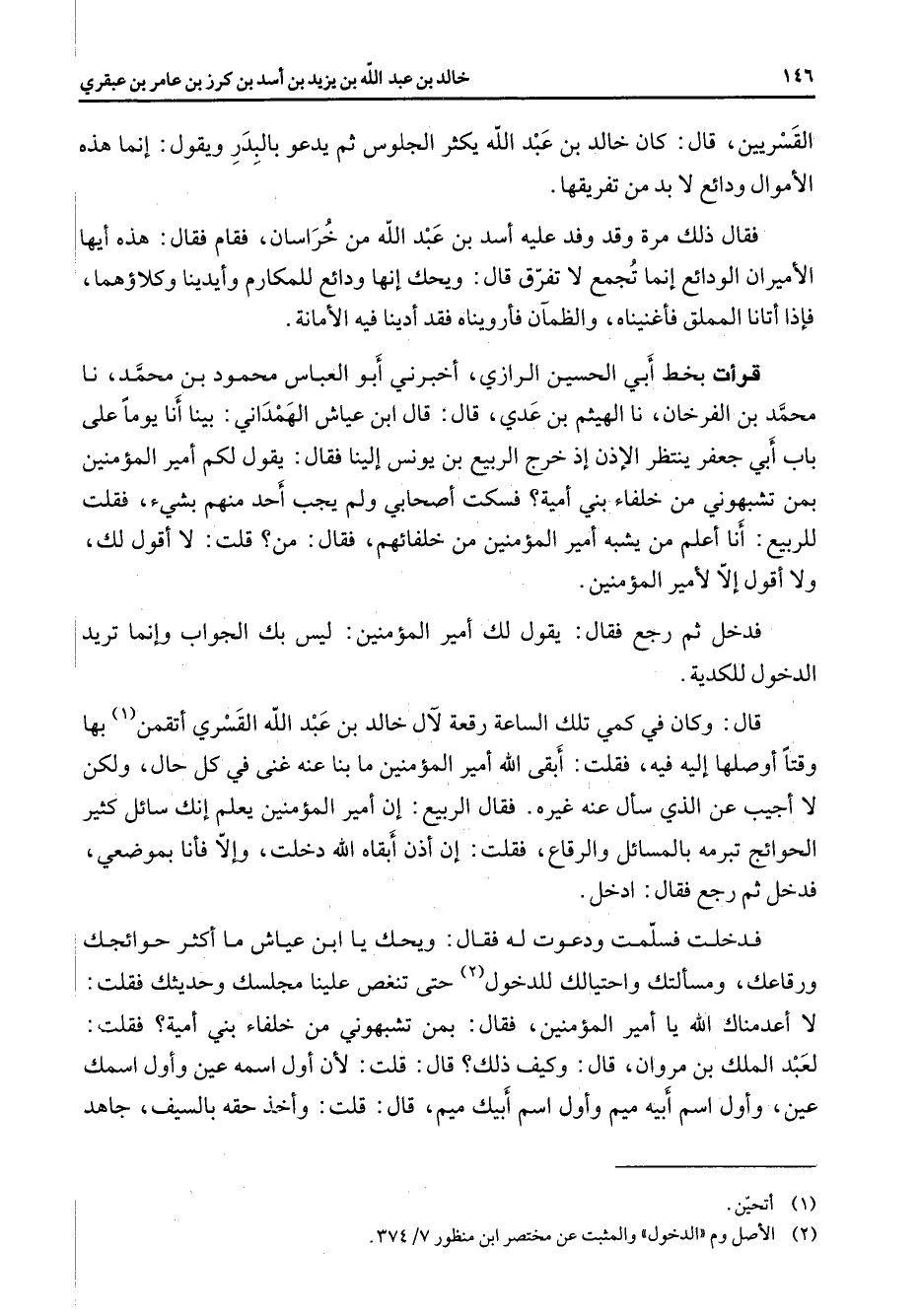 القسريين قال كان خالد بن عبد الله يكثر الجلوس ثم يدعو بالبدر ويقول إنما هذه الأموال ودائع لا بد من تفريقها فقال ذات مرة وقد وفد عليه أسد بن عبد الله من خراسان فقام فقال هذه أيها الأميران الودائع إنما تجمع لا تفرق قال ويحك إنها ودائع للمكارم وأيدينا وكلاؤهما فإذا أتانا المملق فأغنيناه والظمآن فأرويناه فقد أدينا فيه الأمانة قرأت بخط أبي الحسين الرازي أخبرني أبو العباس محمود بن محمد نا محمد بن الفرخان نا الهيثم بن عدي قال قال ابن عياش الهمداني بينا أنا يوما على باب أبي جعفر ينتظر الإذن إذ خرج الربيع بن يونس إلينا فقال يقول لكم أمير المؤمنين بمن تشبهوني من خلفاء بني أمية فسكت أصحابي ولم يجب أحد منهم بشئ فقلت للربيع أنا أعلم من يشبه أمير المؤمنين من خلفائهم فقال من قلت لا أقول لك ولا أقول إلا لأمير المؤمنين فدخل ثم رجع فقال يقول لك أمير المؤمنين ليس بك الجواب وإنما تريد الدخول للكدية قال وكان في كمي تلك الساعة رقعة لآل خالد بن عبد الله القسري أتقمن (1) بها وقتا أوصلها إليه فيه فقلت أبقى الله أمير المؤمنين ما بنا عنه غنى في كل حال ولكن لا أجيب عن الذي سأل عنه غيره فقال الربيع إن أمير المؤمنين يعلم إنك سائل كثير الحوائج تبرمه بالمسائل والرقاع فقلت إن أذن أبقاه الله دخلت وإلا فأنا بموضعي فدخل ثم رجع فقال ادخل فدخلت فسلمت ودعوت له فقال ويحك يا ابن عياش ما أكثر حوائجك ورقاعك ومسألتك واحتيالك للدخول (2) حتى تنغص علينا مجلسك وحديثك فقلت لا أعدمناك الله يا أمير المؤمنين فقال بمن تشبهوني من خلفاء بني أمية فقلت لعبد الملك بن مروان قال وكيف ذلك قال قلت لأن أول اسمه عين وأول اسمك عين وأول اسم أبيه ميم وأول اسم أبيك ميم قال قلت وأخذ حقه بالسيف جاهد