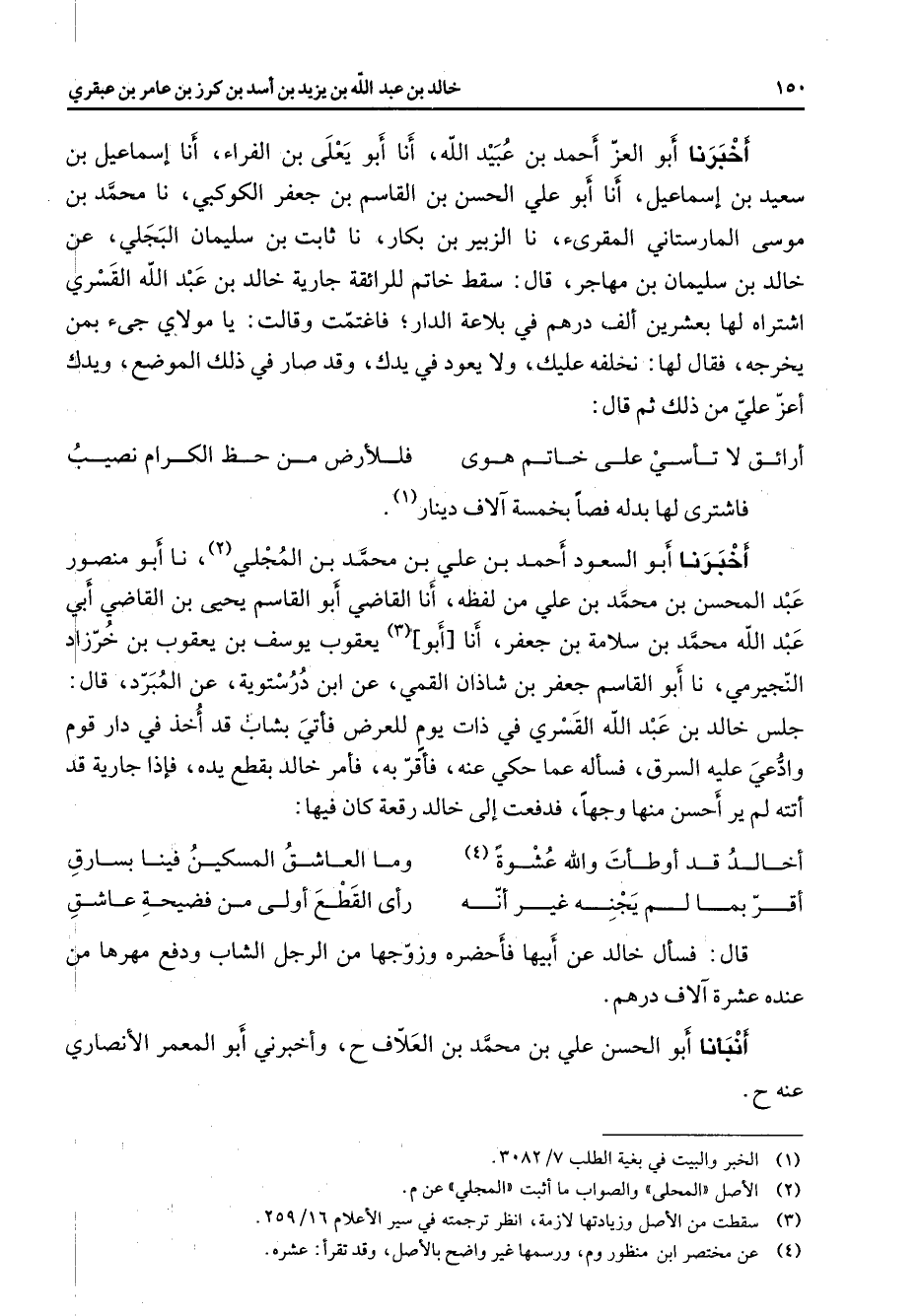 أخبرنا أبو العز أحمد بن عبيد الله أنا أبو يعلى بن الفراء أنا إسماعيل بن سعيد بن إسماعيل أنا أبو علي الحسن بن القاسم بن جعفر الكوكبي نا محمد بن موسى المارستاني المقرئ نا الزبير بن بكار نا ثابت بن سليمان البجلي عن خالد بن سليمان بن مهاجر قال سقط خاتم للرائقة جارية خالد بن عبد الله القسري اشتراه لها بعشرين ألف درهم في بلاعة الدار فاغتمت وقالت يا مولاي جئ بمن يخرجه فقال لها نخلفه عليك ولا يعود في يدك وقد صار في ذلك الموضع ويدك أعز علي من ذلك ثم قال أرائق لا تأسي على خاتم هوى * فللأرض من حظ الكرام نصيب * فاشترى لها بدله فصا بخمسة آلاف دينار (1) أخبرنا أبو السعود أحمد بن علي بن محمد بن المجلي (2) نا أبو منصور عبد المحسن بن محمد بن علي من لفظه أنا القاضي أبو القاسم يحيى بن القاضي أبي عبد الله محمد بن سلامة بن جعفر أنا أبو (3) يعقوب يوسف بن يعقوب بن خرزاد النجيرمي نا أبو القاسم جعفر بن شاذان القمي عن أبن درستوية عن المبرد قال جلس خالد بن عبد الله القسري في ذات يوم للعرض فأتي بشاب قد أخذ في دار قوم وادعي عليه السرق فسأله عما حكي عنه فأقر به فأمر خالد بقطع يده فإذا جارية قد أتته لم ير أحسن منها وجها فدفعت إلى خالد رقعة كان فيها أخالد قد أوطأت والله عشوة (4) * وما العاشق المسكين فينا بسارق أقر بما لم يجنه غير أنه * رأى القطع أولى من فضيحة عاشق * قال فسأل خالد عن أبيها فأحضره وزوجها من الرجل الشاب ودفع مهرها من عنده عشرة آلاف درهم أنبأنا أبو الحسن علي بن محمد بن العلاف وأخبرني أبو المعمر الأنصاري عنه