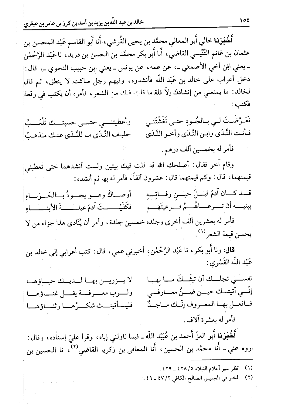 أخبرنا خالي أبو المعالي محمد بن يحيى القرشي أنا أبو القاسم عبد المحسن بن عثمان بن غانم التنيسي القاضي أنا أبو بكر محمد بن الحسن بن دريد نا عبد الرحمن يعني ابن أخي الأصمعي عن عمه عن يونس يعني ابن حبيب النحوي قال دخل أعراب على خالد بن عبد الله فأنشدوه وفيهم رجل ساكت لا ينطق ثم قال لخالد ما يمنعني من إنشادك إلا قلة ما قلت فيك من الشعر فأمره أن يكتب في رقعة فكتب تعرضت لي بالجود حتى نغشتني * وأعطيتني حتى حسبتك تلعب فأنت الندى وابن الندى وأخو الندى * حليف الندى ما للندى عنك مذهب * فأمر له بخمسين ألف درهم وقام آخر فقال أصلحك الله قد قلت فيك بيتين ولست أنشدهما حتى تعطيني قيمتهما قال وكم قيمتهما قال عشرون ألفا فأمر له بها ثم أنشده قد كان آدم قبل حين وفاته * أوصاك وهو يجود بالحوباء ببنيه أن ترعاهم فرعيتهم * فكفيت آدم عيلة الأبناء * فأمر له بعشرين ألف أخرى وجلده خمسين جلدة وأمر أن ينادى هذا جزاء من لا يحسن قيمة الشعر (1) قال ونا أبو بكر نا عبد الرحمن أخبرني عمي قال كتب أعرابي إلى خالد بن عبد الله القسري نفسي تجلك أن تبثك ما بها * لا يزرين بها لديك حياؤها إني أتيتك حين ضن معارفي * ولرب معرفة يقل غناؤها فافعل بها المعروف إنك ماجد * فليأتينك شكرها وثناؤها * فأمر له بعشرة آلاف أخبرنا أبو العز أحمد بن عبيد الله فيما ناولني إياه وقرأ علي إسناده وقال اروه عني أنا محمد بن الحسين أنا المعافى بن زكريا القاضي (2) نا الحسين بن