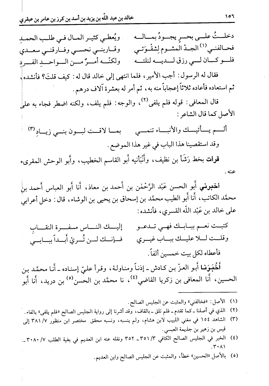 دخلت على بحر يجود بماله * ويعطي كثير المال في طلب الحمد * فحالفني (1) الجد المشوم لشقوتي * وقاربني نحسي وفارقني سعدي فلو كان لي رزق لديه لنلته * ولكنه أمر من الواحد الفرد * فقال له الرسول أجب الأمير فلما انتهى إلى خالد قال له كيف قلت فأنشده ثم استعاده فأعاده ثلاثا إعجابا منه به ثم أمر له بعشرة آلاف درهم قال المعافى قوله فلم يلفى (2) والوجه فلم يلف ولكنه اضطر فجاء به على الأصل كما قال الشاعر ألم يأتيك والأنباء تنمي * بما لاقت لبون بني زياد (3) * وقد استقصينا هذا الباب في غير هذا الموضع قرأت بخط رشأ بن نظيف وأنبأنيه أبو القاسم الخطيب وأبو الوحش المقرئ عنه أخبرني أبو الحسن عبد الرحمن بن أحمد بن معاذ أنا أبو العباس أحمد بن محمد الكاتب أنا أبو الطيب محمد بن إسحاق بن يحيى بن الوشاء قال دخل أعرابي على خالد بن عبد الله القسري فأنشده كتبت نعم ببابك فهي تدعو * إليك الناس مسفرة النقاب وقلت للا عليك بباب غيري * فإنك لن تري أبدا ببابي * فأعطاه لكل بيت خمسين ألفا أخبرنا أبو العز بن كادش إذنا ومناولة وقرأ علي إسناده أنا محمد بن الحسين أنا المعافى بن زكريا القاضي (4) نا محمد بن الحسن (5) بن دريد أنا أبو