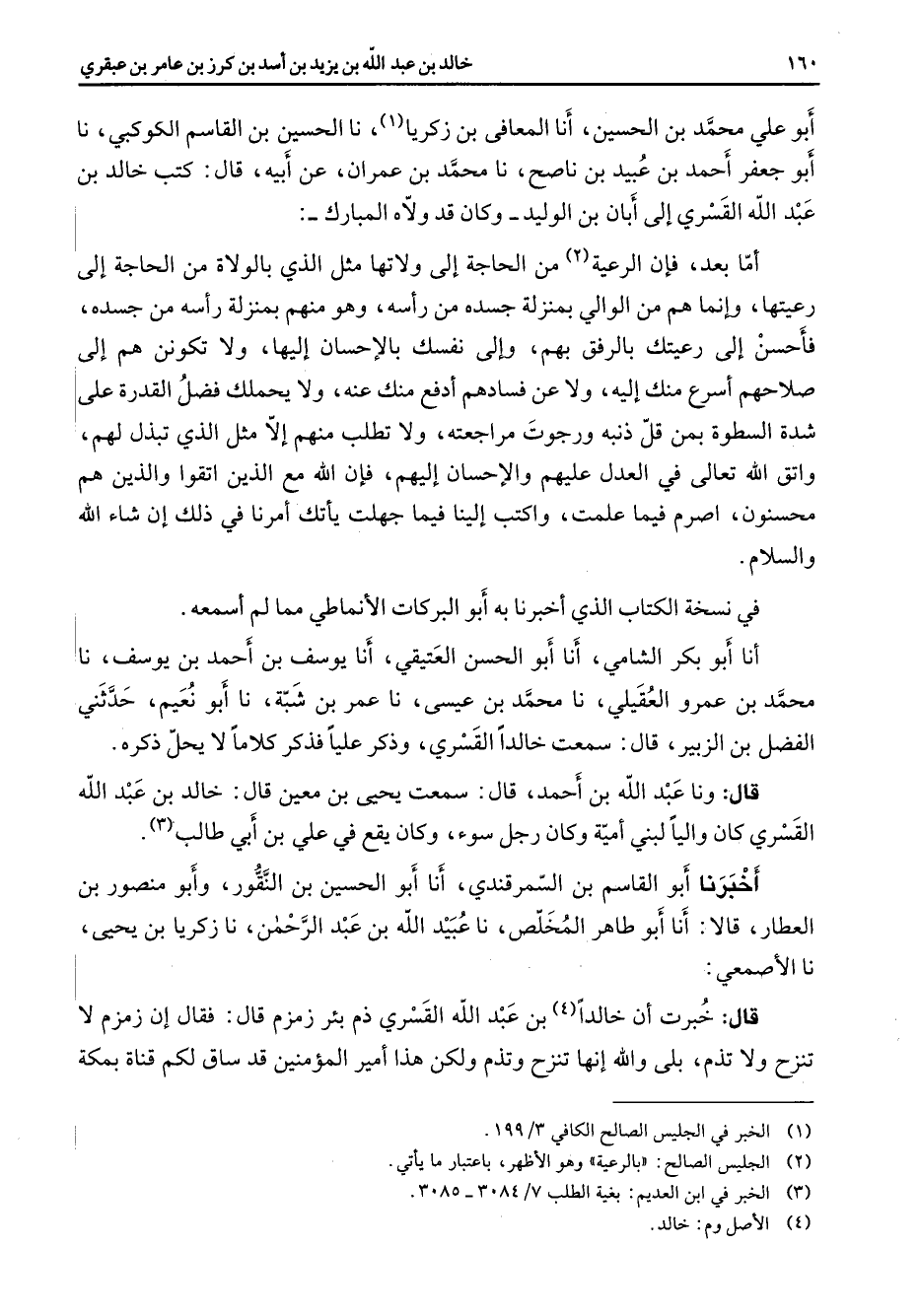 شدة السطوة بمن قل ذنبه ورجوت مراجعته ولا تطلب منهم إلا مثل الذي تبذل لهم واتق الله تعالى في العدل عليهم والإحسان إليهم فإن الله مع الذين اتقوا والذين هم محسنون اصرم فيما علمت واكتب إلينا فيما جهلت يأتك أمرنا في ذلك إن شاء الله والسلام في نسخة الكتاب الذي أخبرنا به أبو البركات الأنماطي مما لم أسمعه أنا أبو بكر الشامي أنا أبو الحسن العتيقي أنا يوسف بن أحمد بن يوسف نا محمد بن عمرو العقيلي نا محمد بن عيسى نا عمر بن شبة نا أبو نعيم حدثني الفضل بن الزبير قال سمعت خالدا القسري وذكر عليا فذكر كلاما لا يحل ذكره قال ونا عبد الله بن أحمد قال سمعت يحيى بن معين قال خالد بن عبد الله القسري كان واليا لبني أمية وكان رجل سوء وكان يقع في علي بن أبي طالب (3) أخبرنا أبو القاسم بن السمرقندي أنا أبو الحسين بن النقور وأبو منصور بن العطار قالا أنا أبو طاهر المخلص نا عبيد الله بن عبد الرحمن نا زكريا بن يحيى نا الأصمعي قال خبرت أن خالدا (4) بن عبد الله القسري ذم بئر زمزم قال فقال إن زمزم لا تنزح ولا تذم بلى والله إنها تنزح وتذم ولكن هذا أمير المؤمنين قد ساق لكم قناة بمكة