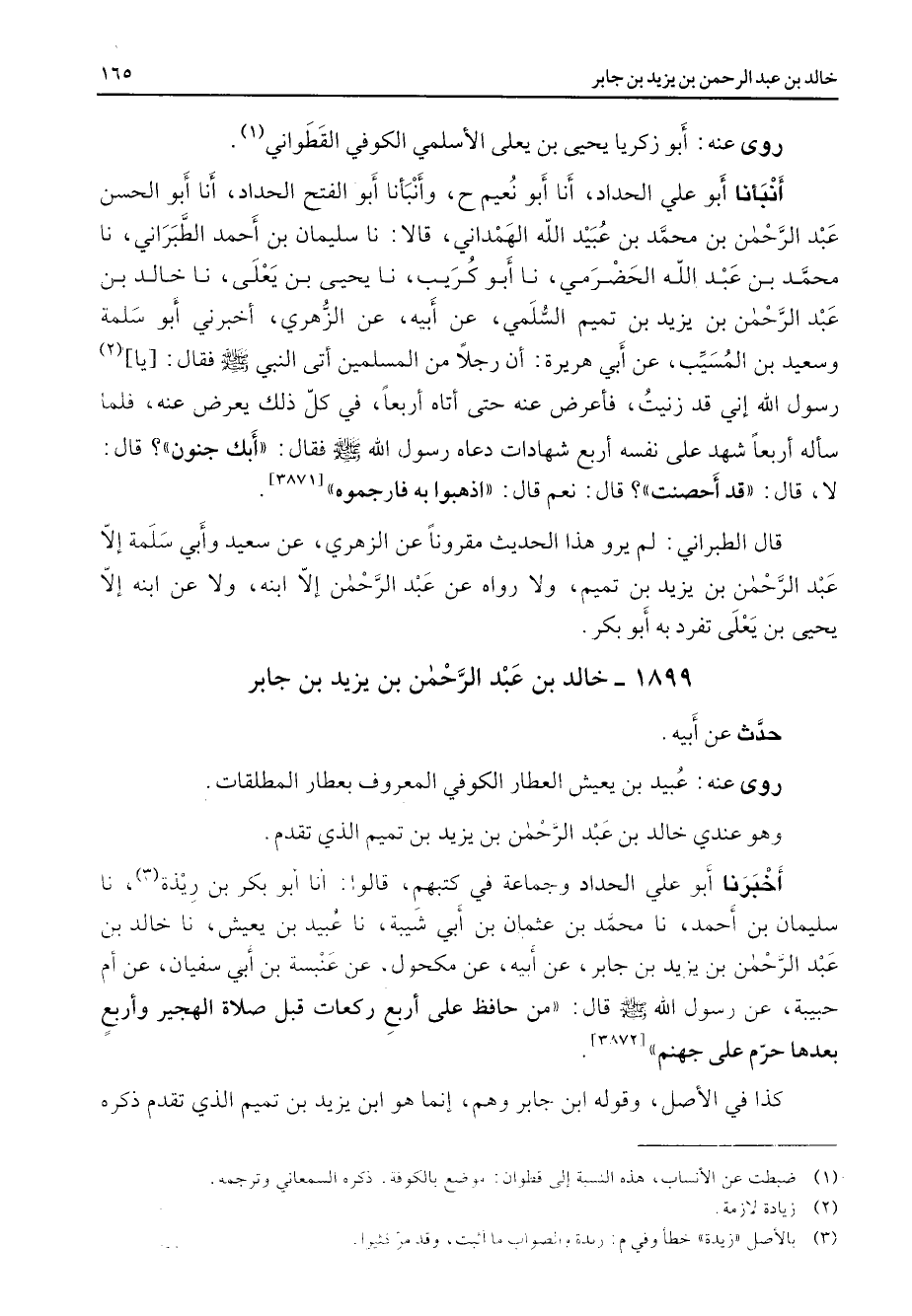 روى عنه أبو زكريا يحيى بن يعلى الأسلمي الكوفي القطواني (1) أنبأنا أبو علي الحداد أنا أبو نعيم وأنبأنا أبو الفتح الحداد أنا أبو الحسن اعبد الرحمن بن محمد بن عبيد الله الهمداني قالا نا سليمان بن أحمد الطبراني نا محمد بن عبد الله الحضرمي نا أبو كريب نا يحيى بن يعلى نا خالد بن عبد الرحمن بن يزيد بن تميم السلمي عن أبيه عن الزهري أخبرني أبو سلمة وسعيد بن المسيب عن أبي هريرة أن رجلا من المسلمين أتى النبي (صلى الله عليه وسلم) فقال يا رسول الله إني قد زنيت فأعرض عنه حتى أتاه أربعا في كل ذلك يعرض عنه فلما سأله أربعا شهد على نفسه أربع شهادات دعاه رسول الله (صلى الله عليه وسلم) فقال أبك جنون قال لا قال قد أحصنت قال نعم قال اذهبوا به فارجموه قال الطبراني لم يرو هذا الحديث مقرونا عن الزهري عن سعيد وأبي سلمة إلا عبد الرحمن بن يزيد بن تميم ولا رواه عن عبد الرحمن إلا ابنه ولا عن ابنه إلا يحيى بن يعلى تفرد به أبو بكر