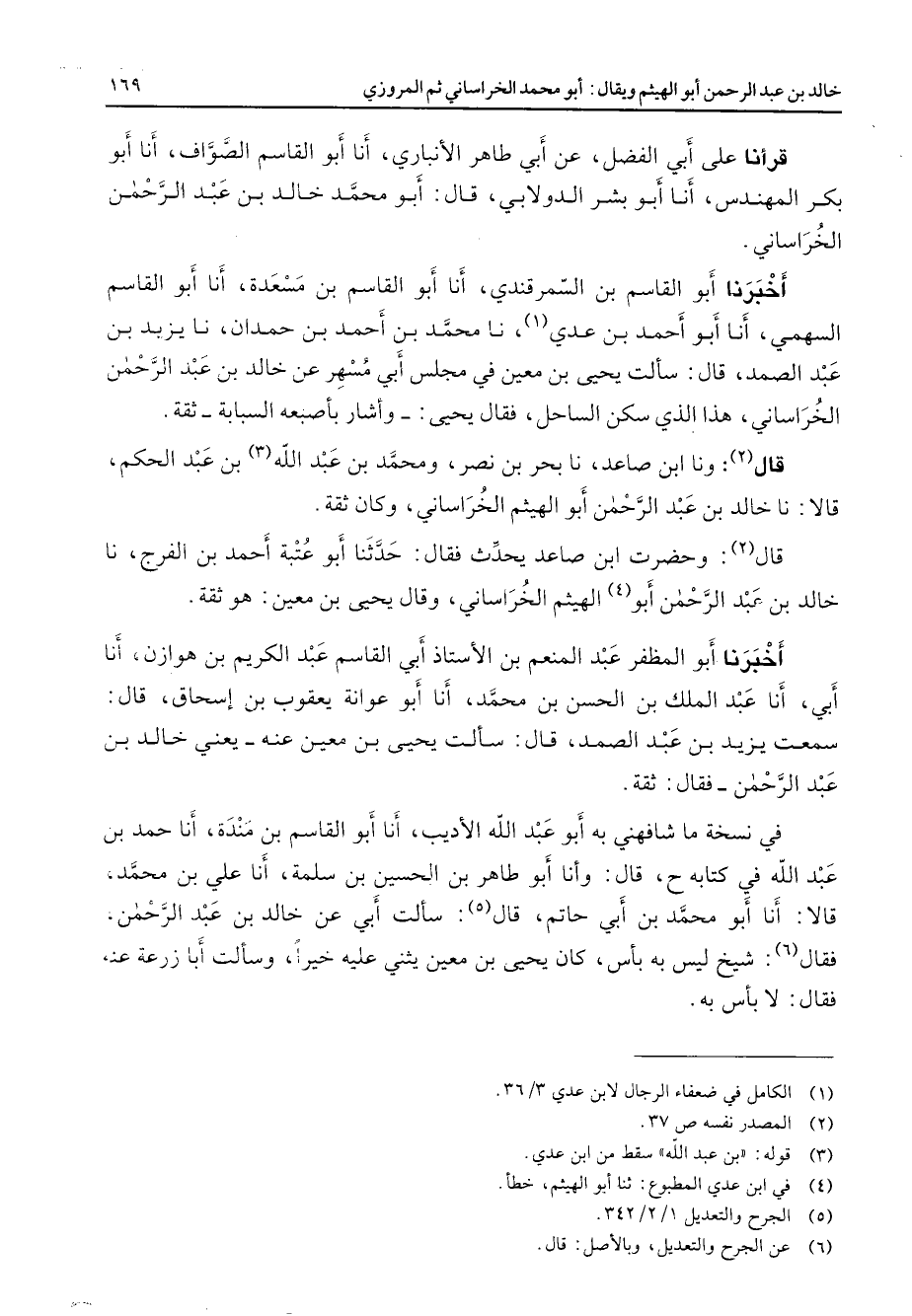 قرأنا على أبي الفضل عن أبي طاهر الأنباري أنا أبو القاسم الصواف أنا أبو بكر المهندس أنا أبو بشر الدولابي قال أبو محمد خالد بن عبد الرحمن الخراساني أخبرنا أبو القاسم بن السمرقندي أنا أبو القاسم بن مسعدة أنا أبو القاسم السهمي أنا أبو أحمد بن عدي (1) نا محمد بن أحمد بن حمدان نا يزيد بن عبد الصمد قال سألت يحيى بن معين في مجلس أبي مسهر عن خالد بن عبد الرحمن الخراساني هذا الذي سكن الساحل فقال يحيى وأشار بأصبعه السبابة ثقة قال (2) ونا ابن صاعد نا بحر بن نصر ومحمد بن عبد الله (3) بن عبد الحكم قالا نا خالد بن عبد الرحمن أبو الهيثم الخراساني وكان ثقة قال (2) وحضرت ابن صاعد يحدث فقال حدثنا أبو عتبة أحمد بن الفرج نا خالد بن عبد الرحمن أبو (4) الهيثم الخراساني وقال يحيى بن معين هو ثقة أخبرنا أبو المظفر عبد المنعم بن الأستاذ أبي القاسم عبد الكريم بن هوازن أنا أبي أنا عبد الملك بن الحسن بن محمد أنا أبو عوانة يعقوب بن إسحاق قال سمعت يزيد بن عبد الصمد قال سألت يحيى بن معين عنه يعني خالد بن عبد الرحمن فقال ثقة في نسخة ما شافهني به أبو عبد الله الأديب أنا أبو القاسم بن مندة أنا حمد بن عبد الله في كتابه قال وأنا أبو طاهر بن الحسين بن سلمة أنا علي بن محمد قالا أنا أبو محمد بن أبي حاتم قال (5) سألت أبي عن خالد بن عبد الرحمن فقال شيخ ليس به بأس كان يحيى بن معين يثني عليه خيرا وسألت أبا زرعة عنه فقال لا بأس به
