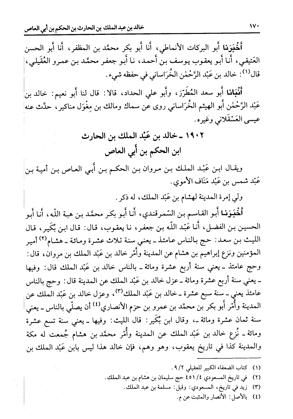 1902 - خالد بن عبد الملك بن الحارث ابن الحكم بن أبي العاص ويقال ابن عبد الملك بن مروان بن الحكم بن أبي العاص بن أمية بن عبد شمس بن عبد مناف الأموي ولي إمرة المدينة لهشام بن عبد الملك له ذكر أخبرنا أبو القاسم بن السمرقندي أنا أبو بكر محمد بن هبة الله أنا أبو الحسين بن الفضل أنا عبد الله بن جعفر نا يعقوب قال قال ابن بكير قال الليث بن سعد حج بالناس عامئذ يعني سنة ثلاث عشرة ومائة هشام (2) أمير المؤمنين ونزع إبراهيم بن هشام عن المدينة وأمر خالد بن عبد الملك بن مروان قال وحج عامئذ يعني سنة أربع عشرة ومائة بالناس خالد بن عبد الملك قال وفيها يعني سنة أربع عشرة ومائة عزل خالد بن عبد الملك عن المدينة قال وحج بالناس عامئذ يعني سنة سبع عشرة خالد بن عبد الملك (3) وعزل خالد بن عبد الملك عن المدينة وأمر أبو بكر بن محمد بن عمرو بن حزم الأنصاري (4) أن يصلي بالناس يعني سنة ثمان عشرة ومائة وقال ابن بكير قال الليث وفيها يعني سنة تسع عشرة ومائة نزع خالد بن عبد الملك عن المدينة وأمر محمد بن هشام جمعت له مكة والمدينة كذا في تاريخ يعقوب وهو وهم فإن خالد هذا ليس بابن عبد الملك بن