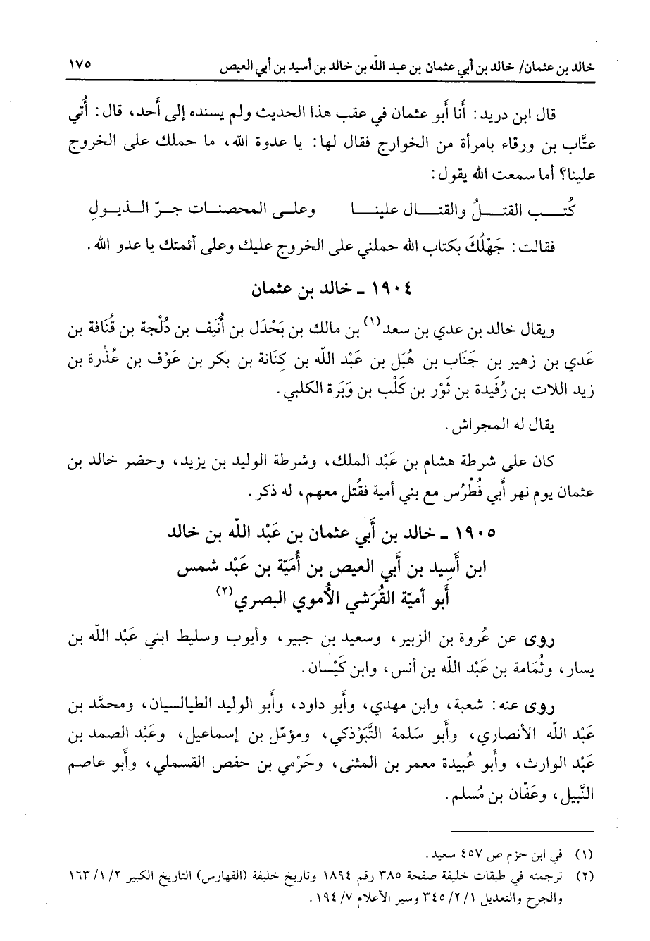 1905 - خالد بن أبي عثمان بن عبد الله بن خالد بن أسيد بن أبي العيص بن أمية بن عبد شمس أبو أمية القرشي الأموي البصري (2) روى عن عروة بن الزبير وسعيد بن جبير وأيوب وسليط ابني عبد الله بن يسار وثمامة بن عبد الله بن أنس وابن كيسان روى عنه شعبة وابن مهدي وأبو داود وأبو الوليد الطيالسيان ومحمد بن عبد الله الأنصاري وأبو سلمة التبوذكي ومؤمل بن إسماعيل وعبد الصمد بن عبد الوارث وأبو عبيدة معمر بن المثنى وحرمي بن حفص القسملي وأبو عاصم النبيل وعفان بن مسلم