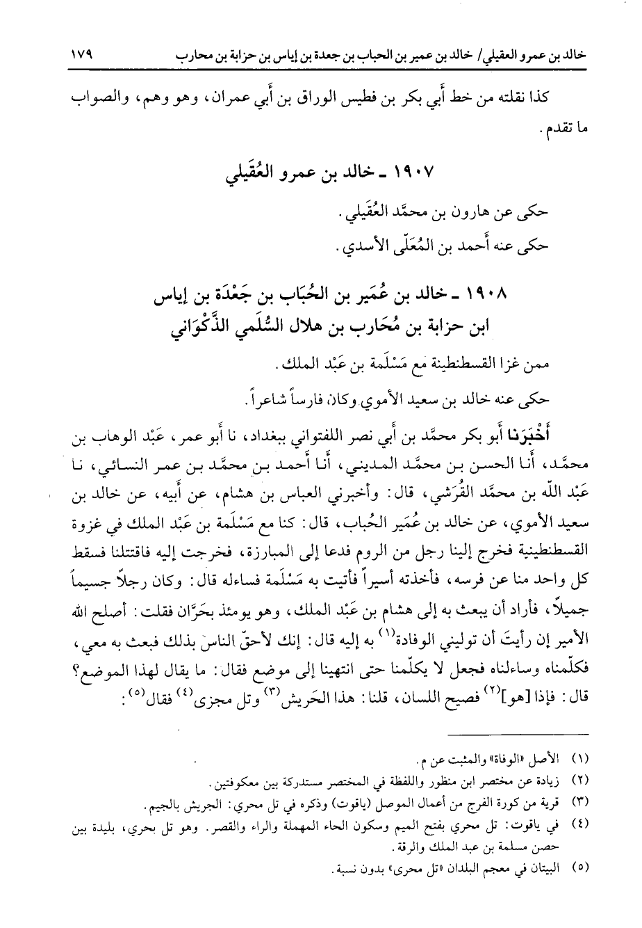 1907 - خالد بن عمرو العقيلي حكى عن هارون بن محمد العقيلي حكى عنه أحمد بن المعلى الأسدي