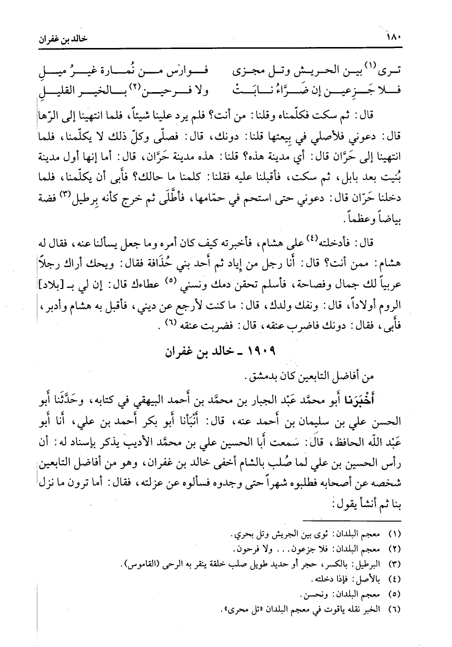 1909 - خالد بن غفران من أفاضل التابعين كان بدمشق أخبرنا أبو محمد عبد الجبار بن محمد بن أحمد البيهقي في كتابه وحدثنا أبو الحسن علي بن سليمان بن أحمد عنه قال أنبأنا أبو بكر أحمد بن علي أنا أبو عبد الله الحافظ قال سمعت أبا الحسين علي بن محمد الأديب يذكر بإسناد له أن رأس الحسين بن علي لما صلب بالشام أخفى خالد بن غفران وهو من أفاضل التابعين شخصه عن أصحابه فطلبوه شهرا حتى وجدوه فسألوه عن عزلته فقال أما ترون ما نزل بنا ثم أنشأ يقول