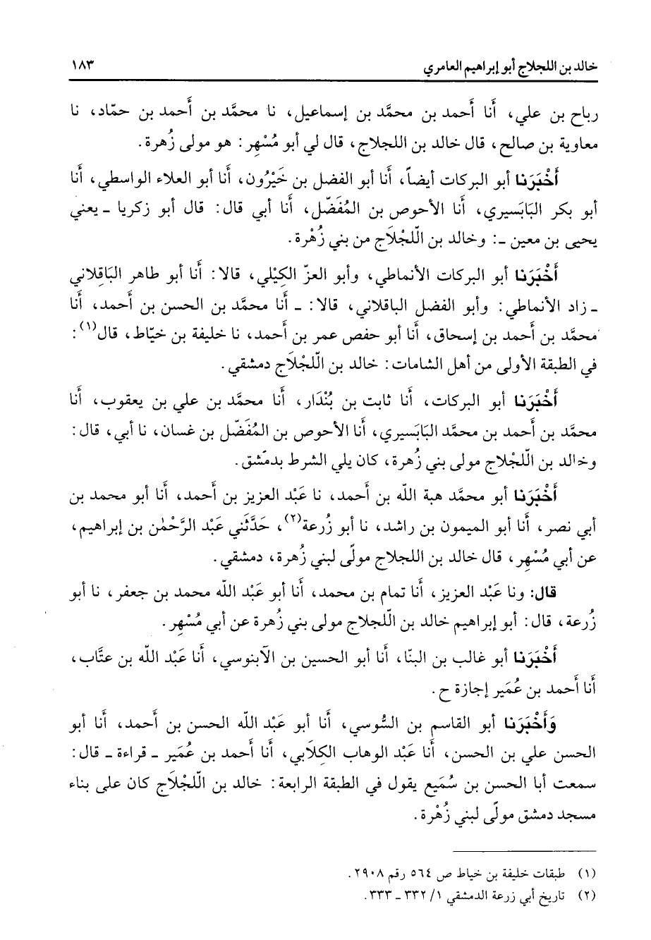 رباح بن علي أنا أحمد بن محمد بن إسماعيل نا محمد بن أحمد بن حماد نا معاوية بن صالح قال خالد بن اللجلاج قال لي أبو مسهر هو مولى زهرة أخبرنا أبو البركات أيضا أنا أبو الفضل بن خيرون أنا أبو العلاء الواسطي أنا أبو بكر البابسيري أنا الأحوص بن المفضل أنا أبي قال قال أبو زكريا يعني يحيى بن معين وخالد بن اللجلاج من بني زهرة أخبرنا أبو البركات الأنماطي وأبو العز الكيلي قالا أنا أبو طاهر الباقلاني زاد الأنماطي وأبو الفضل الباقلاني قالا أنا محمد بن الحسن بن أحمد أنا محمد بن أحمد بن إسحاق أنا أبو حفص عمر بن أحمد نا خليفة بن خياط قال (1) في الطبقة الأولى من أهل الشامات خالد بن اللجلاج دمشقي أخبرنا أبو البركات أنا ثابت بن بندار أنا محمد بن علي بن يعقوب أنا محمد بن أحمد بن محمد البابسيري أنا الأحوص بن المفضل بن غسان نا أبي قال وخالد بن اللجلاج مولى بني زهرة كان يلي الشرط بدمشق أخبرنا أبو محمد هبة الله بن أحمد نا عبد العزيز بن أحمد أنا أبو محمد بن أبي نصر أنا أبو الميمون بن راشد نا أبو زرعة (2) حدثني عبد الرحمن بن إبراهيم عن أبي مسهر قال خالد بن اللجلاج مولى لبني زهرة دمشقي قال ونا عبد العزيز أنا تمام بن محمد أنا أبو عبد الله محمد بن جعفر نا أبو زرعة قال أبو إبراهيم خالد بن اللجلاج مولى بني زهرة عن أبي مسهر أخبرنا أبو غالب بن البنا أنا أبو الحسين بن الآبنوسي أنا عبد الله بن عتاب أنا أحمد بن عمير إجازة وأخبرنا أبو القاسم بن السوسي أنا أبو عبد الله الحسن بن أحمد أنا أبو الحسن علي بن الحسن أنا عبد الوهاب الكلابي أنا أحمد بن عمير قراءة قال سمعت أبا الحسن بن سميع يقول في الطبقة الرابعة خالد بن اللجلاج كان على بناء مسجد دمشق مولى لبني زهرة