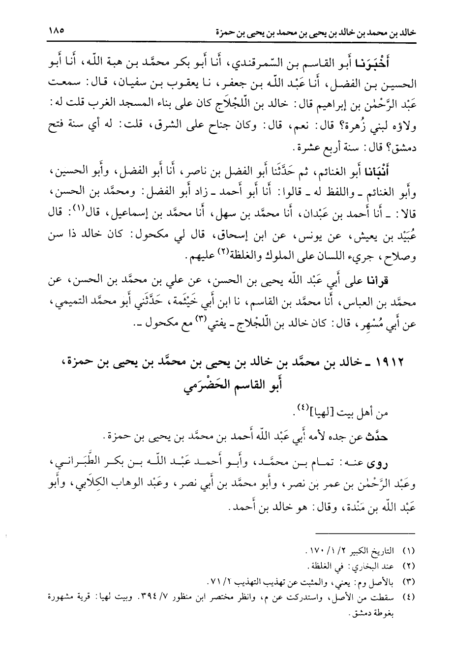 1912 - خالد بن محمد بن خالد بن يحيى بن محمد بن يحيى بن حمزة أبو القاسم الحضرمي من أهل بيت لهيا (4) حدث عن جده لأمه أبي عبد الله أحمد بن محمد بن يحيى بن حمزة روى عنه تمام بن محمد وأبو أحمد عبد الله بن بكر الطبراني وعبد الرحمن بن عمر بن نصر وأبو محمد بن أبي نصر وعبد الوهاب الكلابي وأبو عبد الله بن مندة وقال هو خالد بن أحمد