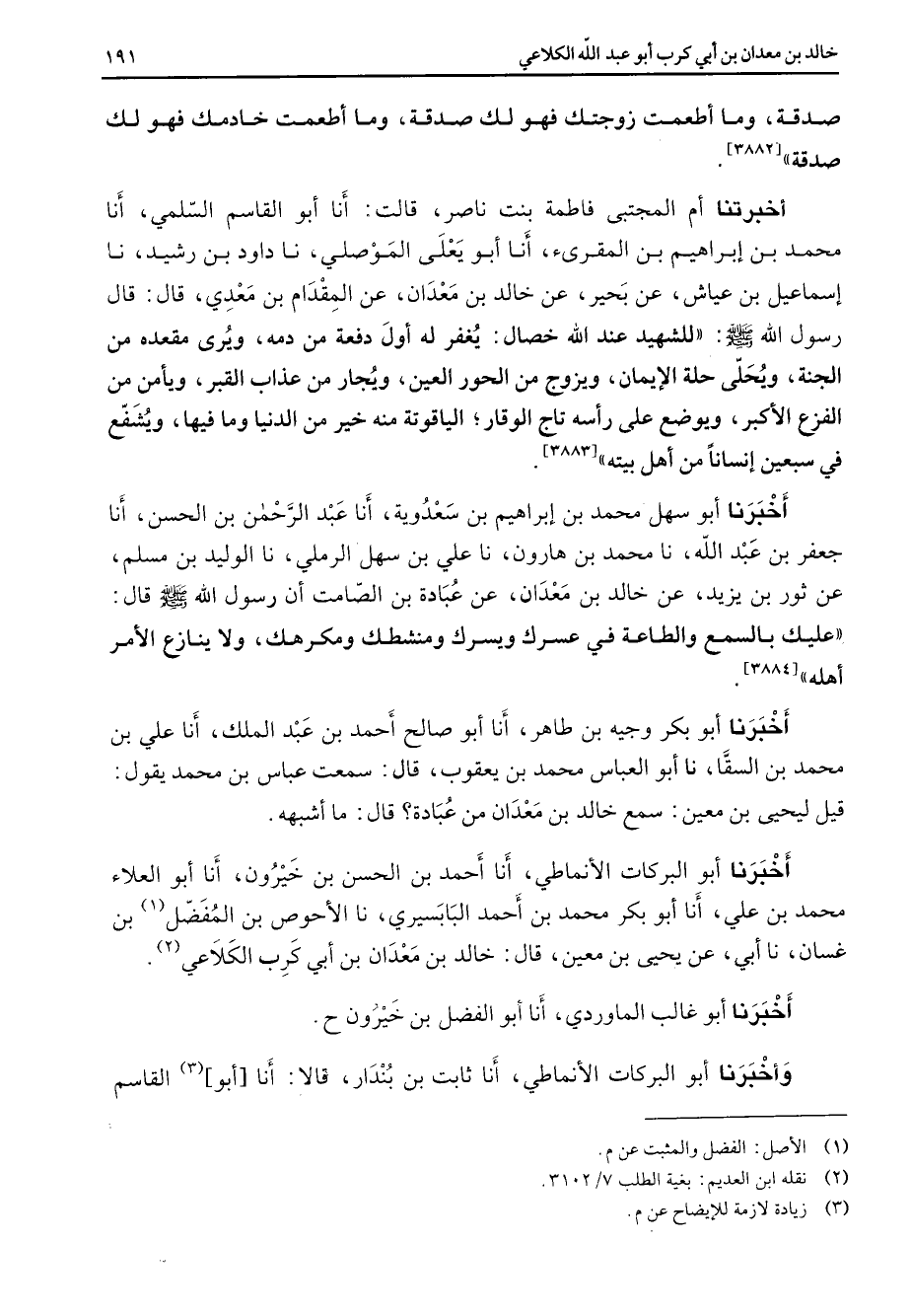 صدقة وما أطعمت زوجتك فهو لك صدقة وما أطعمت خادمك فهو لك صدقة أخبرتنا أم المجتبى فاطمة بنت ناصر قالت أنا أبو القاسم السلمي أنا محمد بن إبراهيم بن المقرئ أنا أبو يعلى الموصلي نا داود بن رشيد نا إسماعيل بن عياش عن بحير عن خالد بن معدان عن المقدام بن معدي قال قال رسول الله (صلى الله عليه وسلم) للشهيد عند الله خصال يغفر له أول دفعة من دمه ويرى مقعده من الجنة ويحلى حلة الإيمان ويزوج من الحور العين ويجار من عذاب القبر ويأمن من الفزع الأكبر ويوضع على رأسه تاج الوقار الياقوته منه خير من الدنيا وما فيها ويشفع في سبعين إنسانا من أهل بيته أخبرنا أبو سهل محمد بن إبراهيم بن سعدوية أنا عبد الرحمن بن الحسن أنا جعفر بن عبد الله نا محمد بن هارون نا علي بن سهل الرملي نا الوليد بن مسلم عن ثور بن يزيد عن خالد بن معدان عن عبادة بن الصامت أن رسول الله (صلى الله عليه وسلم) قال عليك بالسمع والطاعة في عسرك ويسرك ومنشطك ومكرهك ولا ينازع الأمر أهله أخبرنا أبو بكر وجيه بن طاهر أنا أبو صالح أحمد بن عبد الملك أنا علي بن محمد بن السقا نا أبو العباس محمد بن يعقوب قال سمعت عباس بن محمد يقول قيل ليحيى بن معين سمع خالد بن معدان من عبادة قال ما أشبهه أخبرنا أبو البركات الأنماطي أنا أحمد بن الحسن بن خيرون أنا أبو العلاء محمد بن علي أنا أبو بكر محمد بن أحمد البابسيري نا الأحوص بن المفضل (1) بن غسان نا أبي عن يحيى بن معين قال خالد بن معدان بن أبي كرب الكلاعي (2) أخبرنا أبو غالب الماوردي أنا أبو الفضل بن خيرون وأخبرنا أبو البركات الأنماطي أنا ثابت بن بندار قالا أنا أبو (3) القاسم