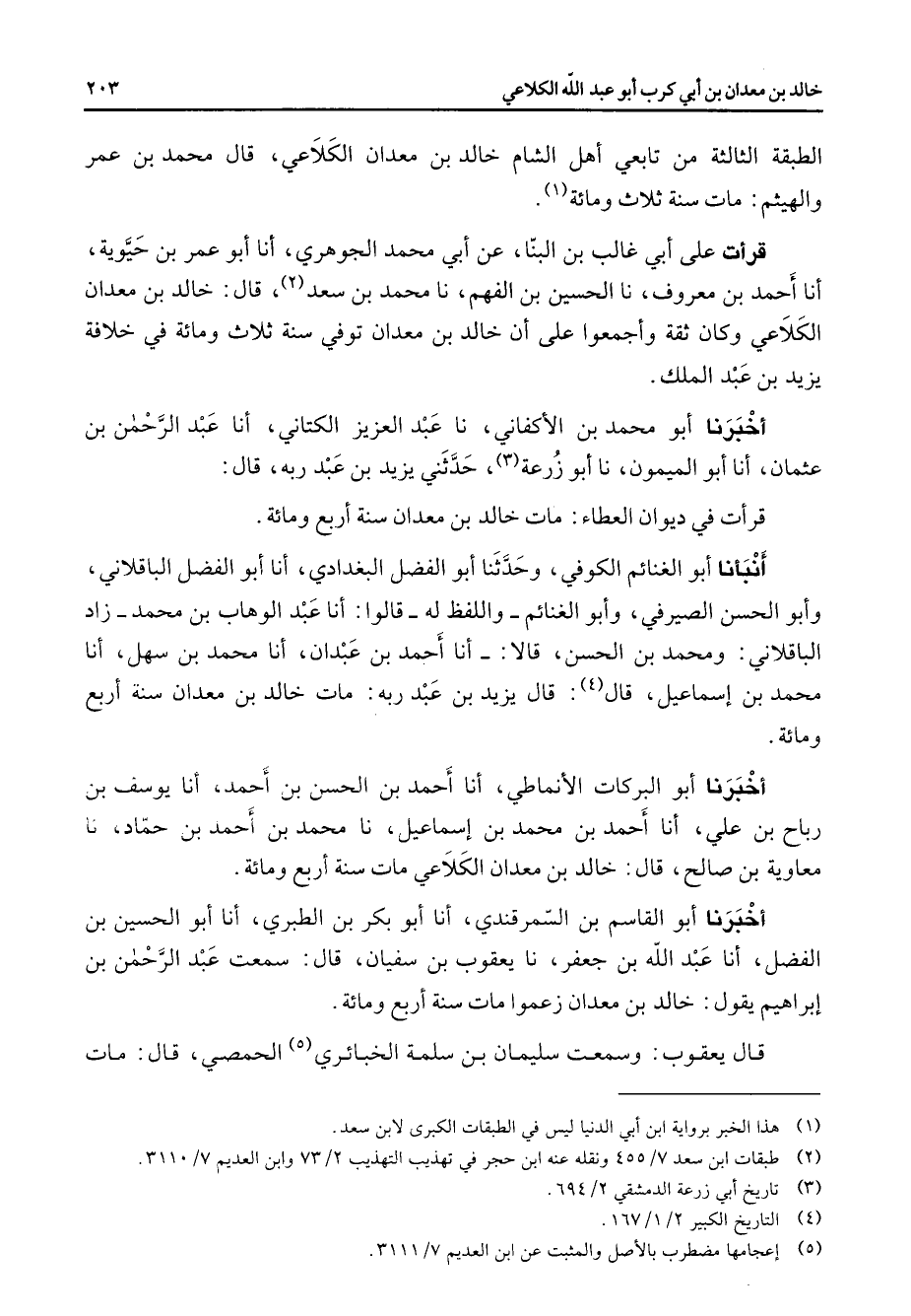 الطبقة الثالثة من تابعي أهل الشام خالد بن معدان الكلاعي قال محمد بن عمر والهيثم مات سنة ثلاث ومائة (1) قرأت على أبي غالب بن البنا عن أبي محمد الجوهري أنا أبو عمر بن حيوية أنا أحمد بن معروف نا الحسين بن الفهم نا محمد بن سعد (2) قال خالد بن معدان الكلاعي وكان ثقة وأجمعوا على أن خالد بن معدان توفي سنة ثلاث ومائة في خلافة يزيد بن عبد الملك أخبرنا أبو محمد بن الأكفاني نا عبد العزيز الكتاني أنا عبد الرحمن بن عثمان أنا أبو الميمون نا أبو زرعة (3) حدثني يزيد بن عبد ربه قال قرأت في ديوان العطاء مات خالد بن معدان سنة أربع ومائة أنبأنا أبو الغنائم الكوفي وحدثنا أبو الفضل البغدادي أنا أبو الفضل الباقلاني وأبو الحسن الصيرفي وأبو الغنائم واللفظ له قالوا أنا عبد الوهاب بن محمد زاد الباقلاني ومحمد بن الحسن قالا أنا أحمد بن عبدان أنا محمد بن سهل أنا محمد بن إسماعيل قال (4) قال يزيد بن عبد ربه مات خالد بن معدان سنة أربع ومائة أخبرنا أبو البركات الأنماطي أنا أحمد بن الحسن بن أحمد أنا يوسف بن رباح بن علي أنا أحمد بن محمد بن إسماعيل نا محمد بن أحمد بن حماد نا معاوية بن صالح قال خالد بن معدان الكلاعي مات سنة أربع ومائة أخبرنا أبو القاسم بن السمرقندي أنا أبو بكر بن الطبري أنا أبو الحسين بن الفضل أنا عبد الله بن جعفر نا يعقوب بن سفيان قال سمعت عبد الرحمن بن إبراهيم يقول خالد بن معدان زعموا مات سنة أربع ومائة قال يعقوب وسمعت سليمان بن سلمة الخبائري (5) الحمصي قال مات