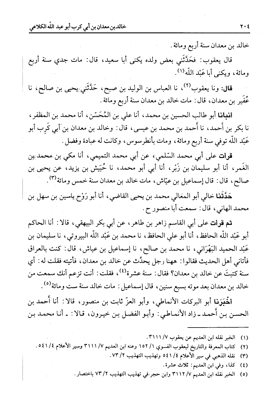 خالد بن معدان سنة أربع ومائة قال يعقوب فحدثني بعض ولده يكنى أبا سعيد قال مات جدي سنة أربع ومائة ويكنى أبا عبد الله (1) قال نا يعقوب (2) نا العباس بن الوليد بن صبح حدثني يحيى بن صالح نا عفير بن معدان قال مات خالد بن معدان سنة أربع ومائة أنبأنا أبو طالب الحسين بن محمد أنا علي بن المحسن أنا محمد بن المظفر نا بكر بن أحمد نا أحمد بن محمد بن عيسى قال وخالد بن معدان بن أبي كرب أبو عبد الله توفي سنة أربع ومائة ومات بأنطرسوس وكانت له عبادة وفضل قرأت على أبي محمد السلمي عن أبي محمد التميمي أنا مكي بن محمد بن الغمر أنا أبو سليمان بن زبر أنا أبي أبو محمد نا حبيش بن يزيد عن يحيى بن صالح قال قال إسماعيل بن عياش مات خالد بن معدان سنة خمس ومائة (3) حدثنا خالي أبو المعالي محمد بن يحيى القاضي أنا أبو روح ياسين بن سهل بن محمد الهاني قال سمعت أبا منصور ثم قرأت على أبي القاسم زاهر بن طاهر عن أبي بكر البيهقي قالا أنا الحاكم أبو عبد الله الحافظ أنا أبو علي الحافظ نا محمد بن عبد الله البيروتي نا سليمان بن عبد الحميد البهراني نا محمد بن صالح نا إسماعيل بن عياش قال كنت بالعراق فأتاني أهل الحديث فقالوا ههنا رجل يحدث عن خالد بن معدان فأتيته فقلت له أي سنة كتبت عن خالد بن معدان فقال سنة عشرة (4) فقلت أنت تزعم أنك سمعت من خالد بن معدان بعد موته بسبع سنين قال إسماعيل مات خالد سنة ست ومائة (5) أخبرنا أبو البركات الأنماطي وأبو العز ثابت بن منصور قالا أنا أحمد بن الحسن بن أحمد زاد الأنماطي وأبو الفضل بن خيرون قالا أنا محمد بن