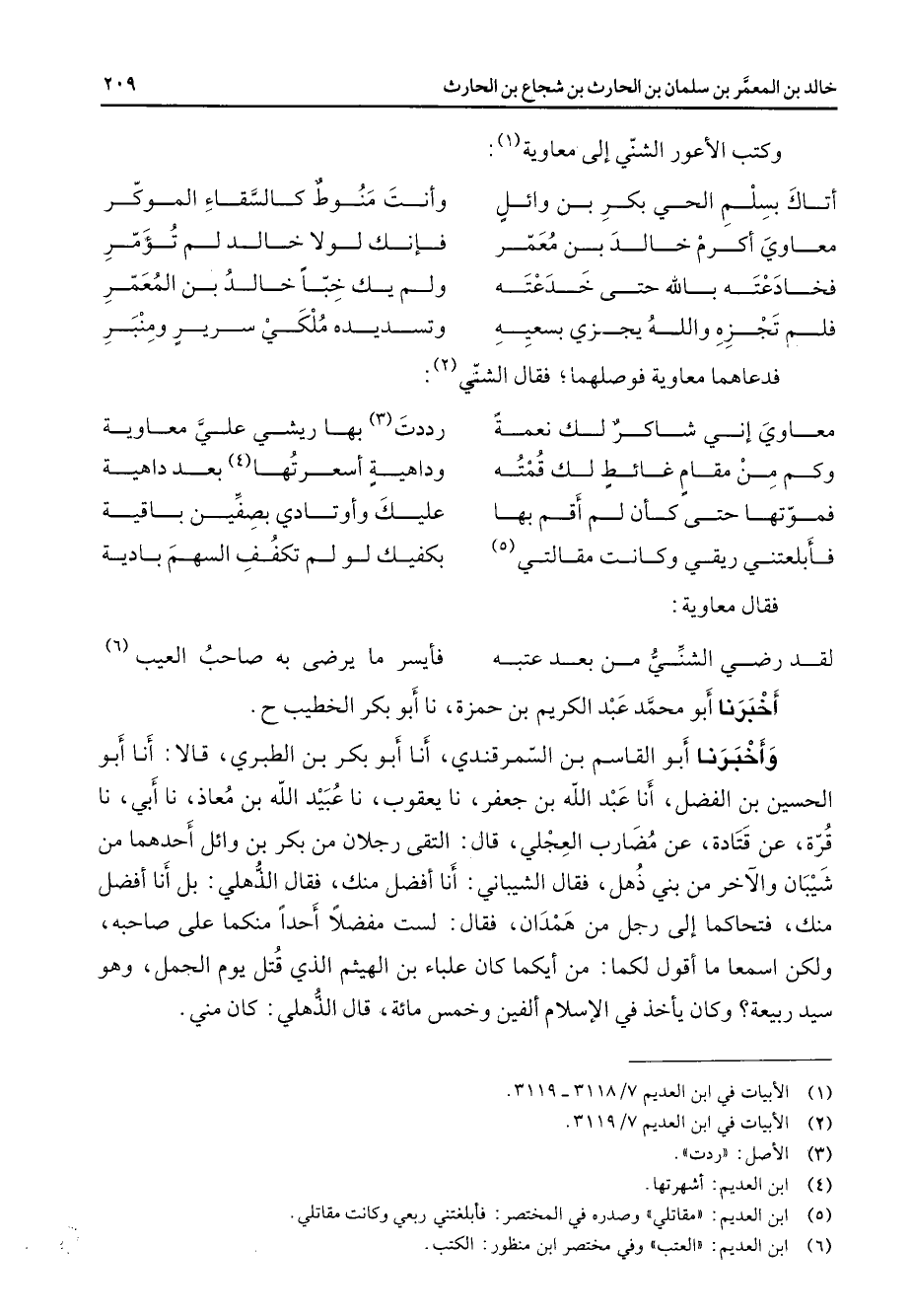 وكتب الأعور الشني إلى معاوية * (1) أتاك بسلم الحي بكر بن وائل * وأنت منوط كالسقاء الموكر معاوي أكرم خالد بن معمر * فإنك لولا خالد لم تأمر فخادعته بالله حتى خدعته * ولم يك خبا خالد بن المعمر فلم تجزه والله يجزي بسعيه * وتسديده ملكي سرير ومنبر * فدعاهما معاوية فوصلهما فقال الشني (2) * معاوي إني شاكر لك نعمة * رددت (3) بها ريشي علي معاوية وكم من مقام غائط لك قمته * وداهية أسعرتها (4) بعد داهية فموتها حتى كأن لم أقم بها * عليك وأوتادي بصفين باقية فأبلعتني ريقي وكانت مقالتي (5) * بكفيك لو لم تكفف السهم بادية * فقال معاوية * لقد رضي الشني من بعد عتبه * فأيسر ما يرضى به صاحب العيب (6) * أخبرنا أبو محمد عبد الكريم بن حمزة نا أبو بكر الخطيب وأخبرنا أبو القاسم بن السمرقندي أنا أبو بكر بن الطبري قالا أنا أبو الحسين بن الفضل أنا عبد الله بن جعفر نا يعقوب نا عبيد الله بن معاذ نا أبي نا قرة عن قتادة عن مضارب العجلي قال التقى رجلان من بكر بن وائل أحدهما من شيبان والآخر من بني ذهل فقال الشيباني أنا أفضل منك فقال الذهلي بل أنا أفضل منك فتحاكما إلى رجل من همدان فقال لست مفضلا أحدا منكما على صاحبه ولكن اسمعا ما أقول لكما من أيكما كان علباء بن الهيثم الذي قتل يوم الجمل وهو سيد ربيعة وكان يأخذ في الإسلام ألفين وخمس مائة قال الذهلي كان مني