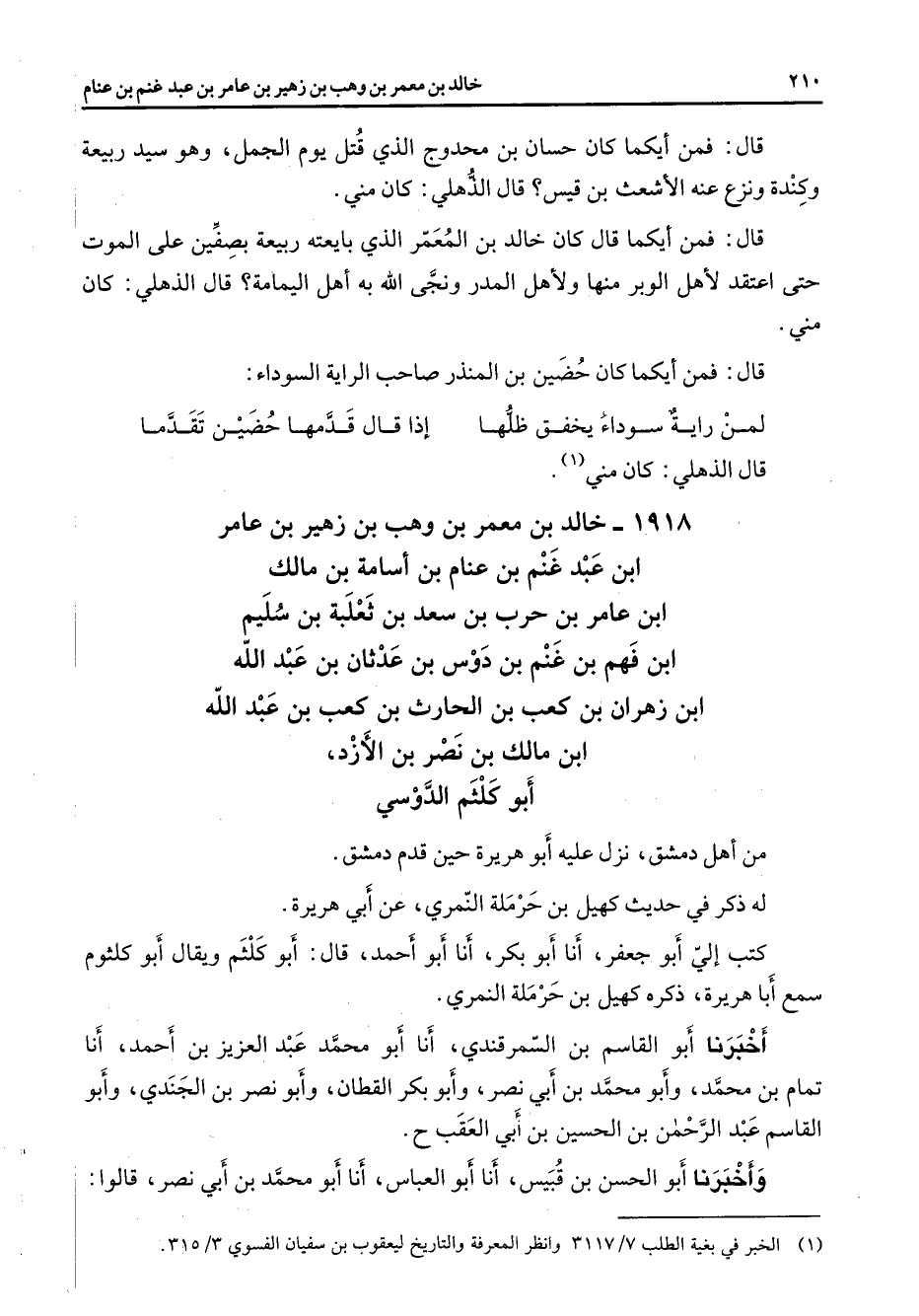 1918 - خالد بن معمر بن وهب بن زهير بن عامر ابن عبد غنم بن عنام بن أسامة بن مالك ابن عامر بن حرب بن سعد بن ثعلبة بن سليم ابن فهم بن غنم بن دوس بن عدثان بن عبد الله بن زهران بن كعب بن الحارث بن كعب بن عبد الله ابن مالك بن نصر بن الأزد أبو كلثم الدوسي من أهل دمشق نزل عليه أبو هريرة حين قدم دمشق له ذكر في حديث كهيل بن حرملة النمري عن أبي هريرة كتب إلي أبو جعفر أنا أبو بكر أنا أبو أحمد قال أبو كلثم ويقال أبو كلثوم سمع أبا هريرة ذكره كهيل بن حرملة النمري أخبرنا أبو القاسم بن السمرقندي أنا أبو محمد عبد العزيز بن أحمد أنا تمام بن محمد وأبو محمد بن أبي نصر وأبو بكر القطان وأبو نصر بن الجندي وأبو القاسم عبد الرحمن بن الحسين بن أبي العقب وأخبرنا أبو الحسن بن قبيس أنا أبو العباس أنا أبو محمد بن أبي نصر قالوا