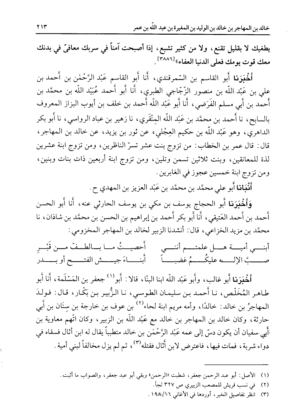 يطغيك لا بقليل تقنع ولا من كثير تشبع إذا أصبحت آمنا في سربك معافى في بدنك معك قوت يومك فعلى الدنيا العفاء أخبرنا أبو القاسم بن السمرقندي أنا أبو القاسم عبد الرحمن بن أحمد بن علي بن عبد الله بن منصور الزجاجي الطبري أنا أبو أحمد عبيد الله بن محمد بن أحمد بن أبي مسلم الفرضي أنا أبو عبد الله أحمد بن خلف بن أيوب البزاز المعروف بالسابح نا أحمد بن محمد بن عبد الله المنقري نا زهير بن عباد الرواسي نا أبو بكر الداهري وهو عبد الله بن حكيم العجلي عن ثور بن يزيد عن خالد بن المهاجر قال قال عمر بن الخطاب من تزوج بنت عشر تسر الناظرين ومن تزوج ابنة عشرين لذة للمعانقين وبنت ثلاثين تسمن وتلين ومن تزوج ابنة أربعين ذات بنات وبنين ومن تزوج ابنة خمسين عجوز في الغابرين أنبأنا أبو علي محمد بن عبد العزيز بن المهدي وأخبرنا أبو الحجاج يوسف بن مكي بن يوسف الحارثي عنه أنا أبو الحسن أحمد بن أحمد العتيقي أنا أبو بكر أحمد بن إبراهيم بن الحسن بن محمد بن شاذان نا محمد بن مزيد الخزاعي قال أنشدنا الزبير لخالد بن المهاجر المخزومي أبني أمية هل علمتم أنني * أحصيت ما بالطف من قبر صب الإله عليكم غضبا * أبناء جيش الفتح أو بدر * أخبرنا أبو غالب وأبو عبد الله ابنا البنا قالا أبو (1) جعفر بن المسلمة أنا أبو طاهر المخلص نا أحمد بن سليمان الطوسي نا الزبير بن بكار قال فولد المهاجر بن خالد خالدا وأمه مريم ابنة لحاء (2) بن عوف بن خارجة بن سنان بن أبي حارثة وكان خالد بن المهاجر بن خالد مع عبد الله بن الزبير وكان اتهم معاوية بن أبي سفيان أن يكون دس إلى عمه عبد الرحمن بن خالد متطببا يقال له ابن أثال فسقاه في دواء شربة فمات فيها فاعترض لابن أثال فقتله (3) ثم لم يزل مخالفا لبني أمية