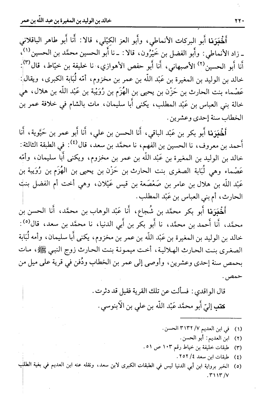أخبرنا أبو البركات الأنماطي وأبو العز الكيلي قالا أنا أبو طاهر الباقلاني زاد الأنماطي وأبو الفضل بن خيرون قالا نا أبو الحسين محمد بن الحسين (1) أنا أبو الحسين (2) الأصبهاني أنا أبو حفص الأهوازي نا خليفة بن خياط قال (3) خالد بن الوليد بن المغيرة بن عبد الله بن عمر بن مخزوم أمه لبابة الكبرى ويقال عصماء بنت الحارث بن حزن بن يحيى بن الهزم بن رويبة بن عبد الله بن هلال هي خالة بني العباس بن عبد المطلب يكنى أبا سليمان مات بالشام في خلافة عمر بن الخطاب سنة إحدى وعشرين أخبرنا أبو بكر بن عبد الباقي أنا الحسن بن علي أنا أبو عمر بن حيوية أنا أحمد بن معروف نا الحسين بن الفهم نا محمد بن سعد قال (4) في الطبقة الثالثة خالد بن الوليد بن المغيرة بن عبد الله بن عمر بن مخزوم ويكنى أبا سليمان وأمه عصماء وهي لبابة الصغرى بنت الحارث بن حزن بن يحيى بن الهزم بن رويبة بن عبد الله بن هلال بن عامر بن صعصعة بن قيس عيلان وهي أخت أم الفضل بنت الحارث أم بني العباس بن عبد المطلب أخبرنا أبو بكر محمد بن شجاع أنا عبد الوهاب بن محمد أنا الحسن بن محمد أنا أحمد بن محمد نا أبو بكر بن أبي الدنيا نا محمد بن سعد قال (5) خالد بن الوليد بن المغيرة بن عبد الله بن عمر بن مخزوم يكنى أبا سليمان وأمه لبابة الصغرى بنت الحارث الهلالية أخت ميمونة بنت الحارث زوج النبي (صلى الله عليه وسلم) مات بحمص سنة إحدى وعشرين وأوصى إلى عمر بن الخطاب ودفن في قرية على ميل من حمص قال الواقدي فسألت عن تلك القرية فقيل قد دثرت كتب إلي أبو محمد عبد الله بن علي بن الآبنوسي