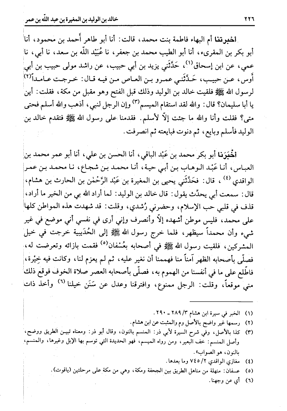 أخبرتنا أم البهاء فاطمة بنت محمد قالت أنا أبو طاهر أحمد بن محمود أنا أبو بكر بن المقرئ أنا أبو الطيب محمد بن جعفر نا عبيد الله بن سعد نا أبي نا عمي عن أبن إسحاق (1) حدثني يزيد بن أبي حبيب عن راشد مولى حبيب بن أبي أوس عن حبيب حدثني عمرو بن العاص من فيه قال خرجت عامدا (2) لرسول الله (صلى الله عليه وسلم) فلقيت خالد بن الوليد وذلك قبل الفتح وهو مقبل من مكة فقلت أين يا أبا سليمان قال والله لقد استقام الميسم (3) وإن الرجل لنبي أذهب والله أسلم فحتى متى فقلت وأنا والله ما جئت إلا لأسلم فقدمنا على رسول الله (صلى الله عليه وسلم) فتقدم خالد بن الوليد فأسلم وبايع ثم دنوت فبايعته ثم انصرفت أخبرنا أبو بكر محمد بن عبد الباقي أنا الحسن بن علي أنا أبو عمر محمد بن العباس أنا عبد الوهاب بن أبي حية أنا محمد بن شجاع نا محمد بن عمر الواقدي (4) قال فحدثني يحيى بن المغيرة بن عبد الرحمن بن الحارث بن هشام قال سمعت أبي يحدث يقول قال خالد بن الوليد لما أراد الله بي من الخير ما أراد قذف في قلبي حب الإسلام وحضرني رشدي وقلت قد شهدت هذه المواطن كلها على محمد فليس موطن أشهده إلا وأنصرف وإني أرى في نفسي أني موضع في غير شئ وأن محمدا سيظهر فلما خرج رسول الله (صلى الله عليه وسلم) إلى الحديبة خرجت في خيل المشركين فلقيت رسول الله (صلى الله عليه وسلم) في أصحابه بعسفان (5) فقمت بإزائه وتعرضت له فصلى بأصحابه الظهر آمنا منا فهممنا أن نغير عليه ثم لم يعزم لنا وكانت فيه خيرة فاطلع على ما في أنفسنا من الهموم به فصلى بأصحابه العصر صلاة الخوف فوقع ذلك مني موقعا قلت الرجل ممنوع وافترقنا وعدل عن سنن خيلنا (6) وأخذ ذات