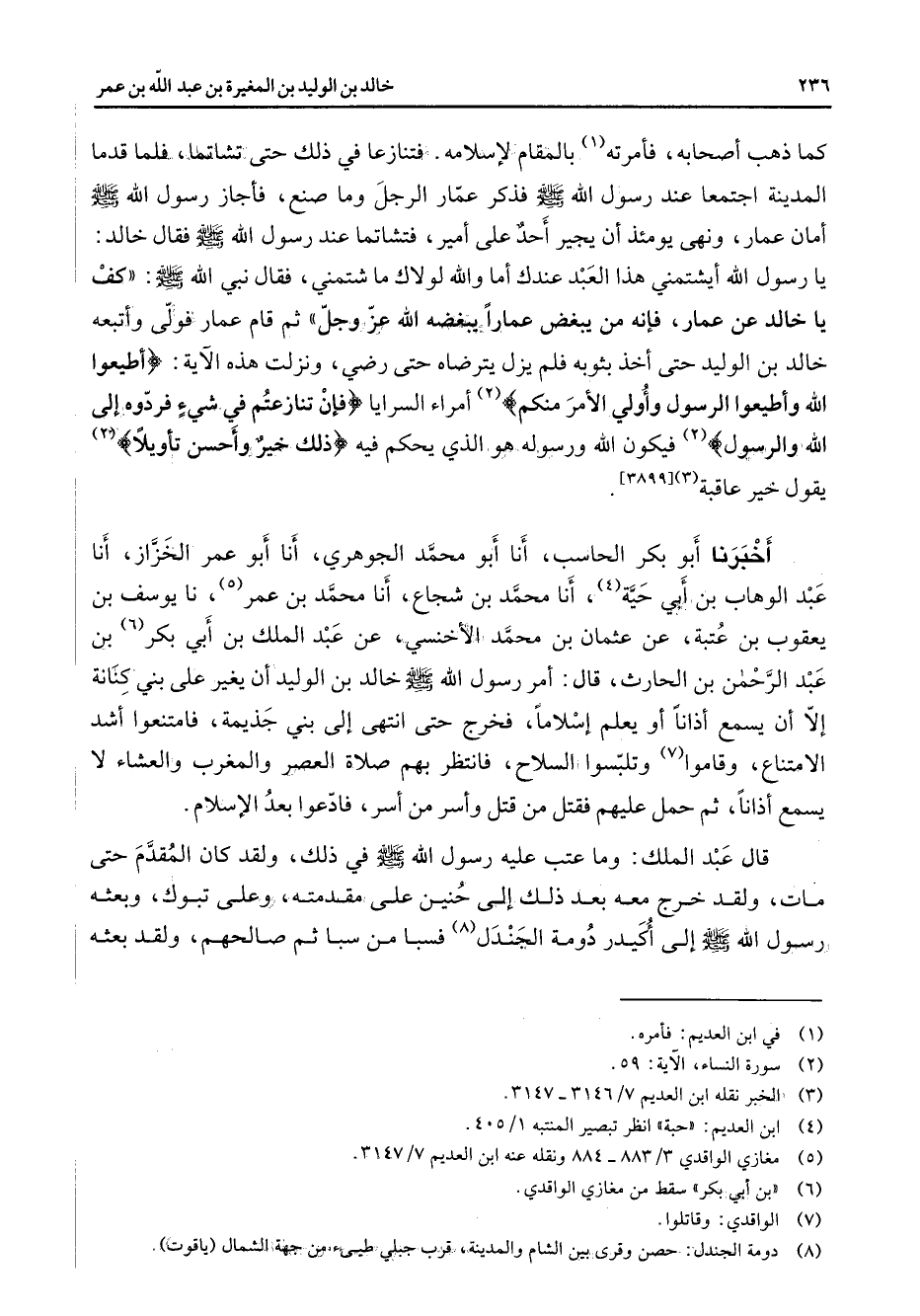 كما ذهب أصحابه فأمرته (1) بالمقام لإسلامه فتنازعا في ذلك حتى تشاتما فلما قدما المدينة اجتمعا عند رسول الله (صلى الله عليه وسلم) فذكر عمار الرجل وما صنع فأجاز رسول الله (صلى الله عليه وسلم) أمان عمار ونهى يومئذ أن يجير أحد على أمير فتشاتما عند رسول الله (صلى الله عليه وسلم) فقال خالد يا رسول الله أيشتمني هذا العبد عندك أما والله لولاك ما شتمني فقال نبي الله (صلى الله عليه وسلم) كف يا خالد عن عمار فإنه من يبغض عمارا يبغضه الله عز وجل ثم قام عمار فولى وأتبعه خالد بن الوليد حتى أخذ بثوبه فلم يزل يترضاه حتى رضي ونزلت هذه الآية " أطيعوا الله وأطيعوا الرسول وأولي الأمر منكم " (2) أمراء السرايا " فإن تنازعتم في شئ فردوه إلى الله والرسول " (2) فيكون الله ورسوله هو الذي يحكم فيه " ذلك خير وأحسن تأويلا " (2) يقول خير عاقبة (3) أخبرنا أبو بكر الحاسب أنا أبو محمد الجوهري أنا أبو عمر الخزاز أنا عبد الوهاب بن أبي حية (4) انا محمد بن شجاع أنا محمد بن عمر (5) نا يوسف بن يعقوب بن عتبة عن عثمان بن محمد الأخنسي عن عبد الملك بن أبي بكر (6) بن عبد الرحمن بن الحارث قال أمر رسول الله (صلى الله عليه وسلم) خالد بن الوليد أن يغير على بني كنانة إلا أن يسمع أذانا أو يعلم إسلاما فخرج حتى انتهى إلى بني جذيمة فامتنعوا أشد الامتناع وقاموا (7) وتلبسوا السلاح فانتظر بهم صلاة العصر والمغرب والعشاء لا يسمع أذانا ثم حمل عليهم فقتل من قتل وأسر من أسر فادعوا بعد الإسلام قال عبد الملك وما عتب عليه رسول الله (صلى الله عليه وسلم) في ذلك ولقد كان المقدم حتى مات ولقد خرج معه بعد ذلك إلى حنين على مقدمته وعلى تبوك وبعثه رسول الله (صلى الله عليه وسلم) إلى أكيدر دومة الجندل (8) فسبا من سبا ثم صالحهم ولقد بعثه