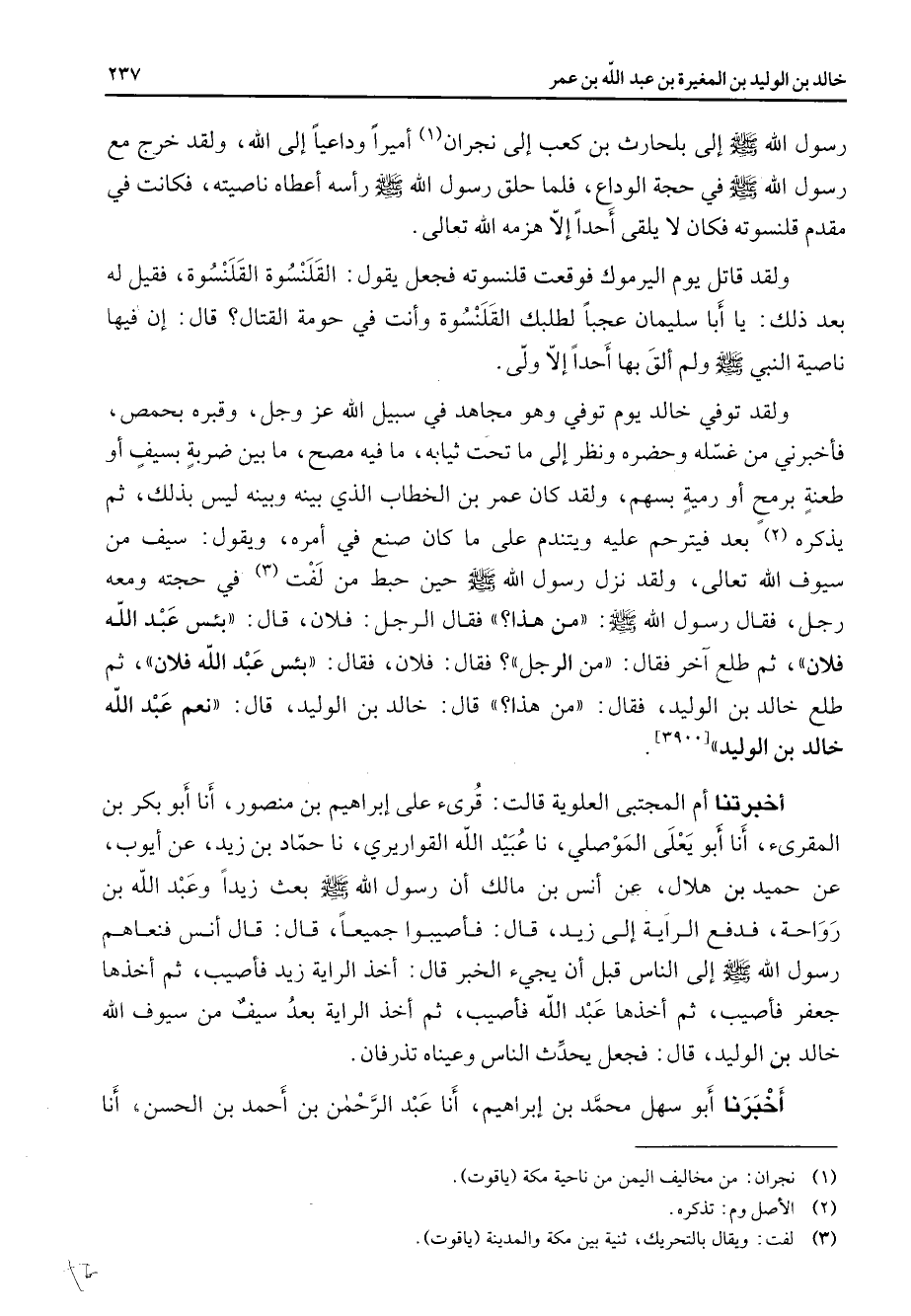 رسول الله (صلى الله عليه وسلم) إلى بلحارث بن كعب إلى نجران (1) أميرا وداعيا إلى الله ولقد خرج مع رسول الله (صلى الله عليه وسلم) في حجة الوداع فلما حلق رسول الله (صلى الله عليه وسلم) رأسه أعطاه ناصيته فكانت في مقدم قلنسوته فكان لا يلقى أحدا إلا هزمه الله تعالى ولقد قاتل يوم اليرموك فوقعت قلنسوته فجعل يقول القلنسوة القلنسوة فقيل له بعد ذلك يا أبا سليمان عجبا لطلبك القلنسوة وأنت في حومة القتال قال إن فيها ناصية النبي (صلى الله عليه وسلم) ولم ألق بها أحدا إلا ولى ولقد توفي خالد يوم توفي وهو مجاهد في سبيل الله عز وجل وقبره بحمص فأخبرني من غسله وحضره ونظر إلى ما تحت ثيابه ما فيه مصح ما بين ضربة بسيف أو طعنة برمح أو رمية بسهم ولقد كان عمر بن الخطاب الذي بينه وبينه ليس بذلك ثم يذكره (2) بعد فيترحم عليه ويتندم على ما كان صنع في أمره ويقول سيف من سيوف الله تعالى ولقد نزل رسول الله (صلى الله عليه وسلم) حين حبط من لفت (3) في حجته ومعه رجل فقال رسول الله (صلى الله عليه وسلم) من هذا فقال الرجل فلان قال بئس عبد الله فلان ثم طلع آخر فقال من الرجل فقال فلان فقال بئس عبد الله فلان ثم طلع خالد بن الوليد فقال من هذا قال خالد بن الوليد قال نعم عبد الله خالد بن الوليد أخبرتنا أم المجتبى العلوية قالت قرئ على إبراهيم بن منصور أنا أبو بكر بن المقرئ أنا أبو يعلى الموصلي نا عبيد الله القواريري نا حماد بن زيد عن أيوب عن حميد بن هلال عن أنس بن مالك أن رسول الله (صلى الله عليه وسلم) بعث زيدا وعبد الله بن رواحة فدفع الراية إلى زيد قال فأصيبوا جميعا قال قال أنس فنعاهم رسول الله (صلى الله عليه وسلم) إلى الناس قبل أن يجئ الخبر قال أخذ الراية زيد فأصيب ثم أخذها جعفر فأصيب ثم أخذها عبد الله فأصيب ثم أخذ الراية بعد سيف من سيوف الله خالد بن الوليد قال فجعل يحدث الناس وعيناه تذرفان أخبرنا أبو سهل محمد بن إبراهيم أنا عبد الرحمن بن أحمد بن الحسن أنا